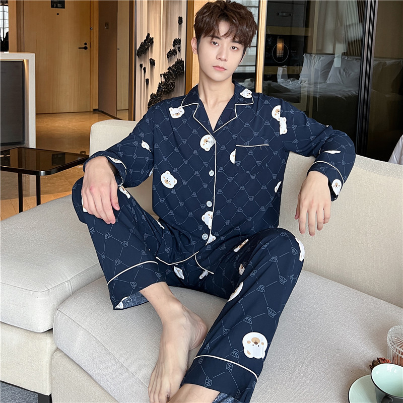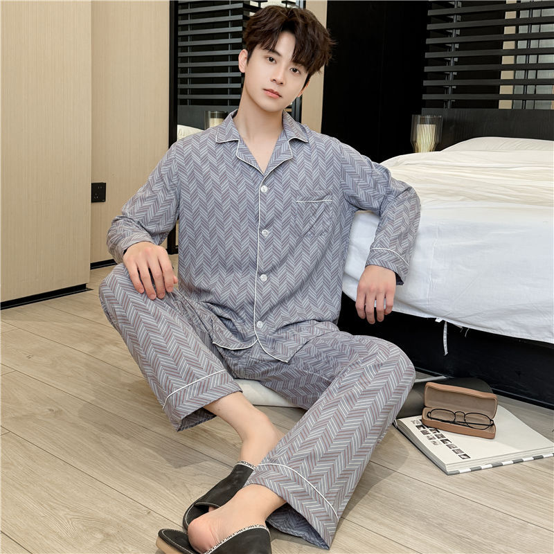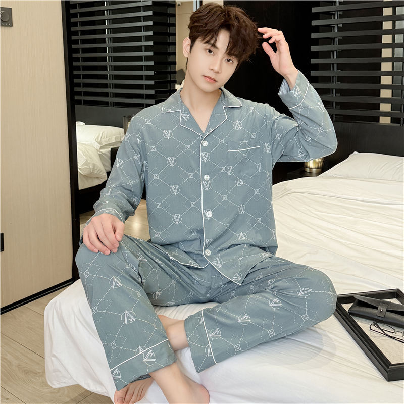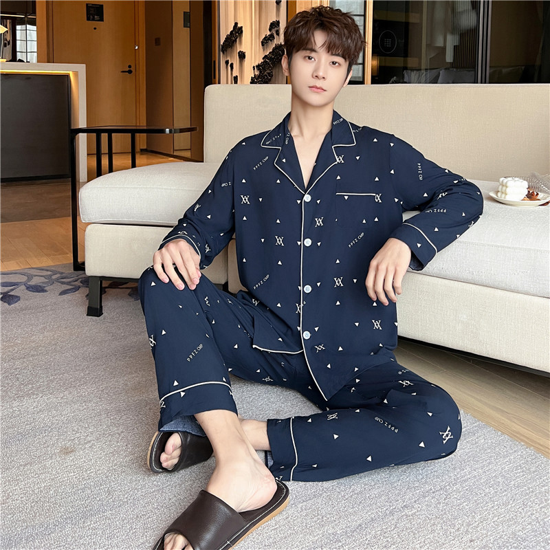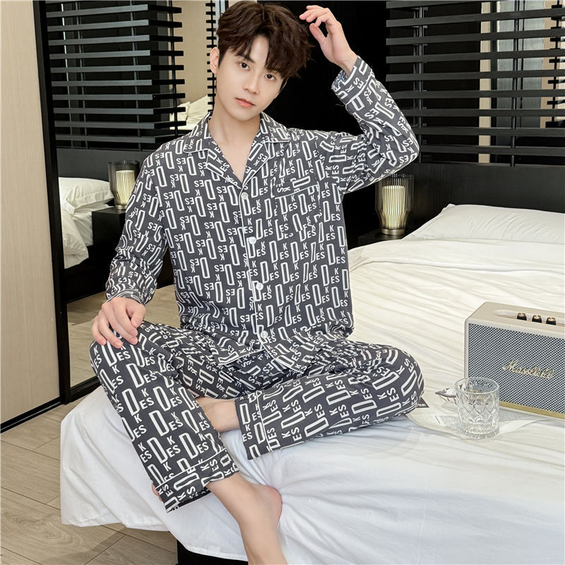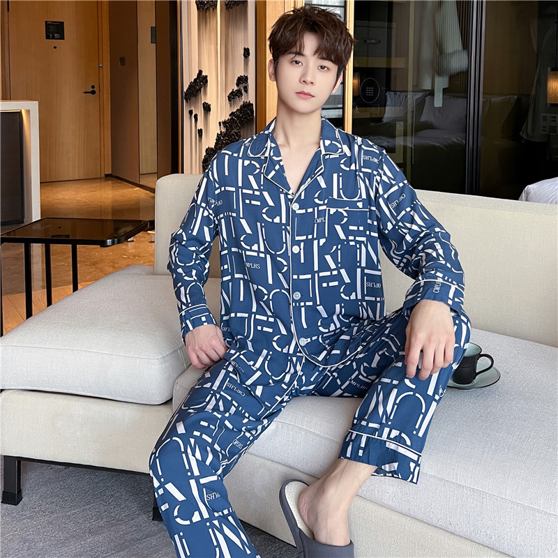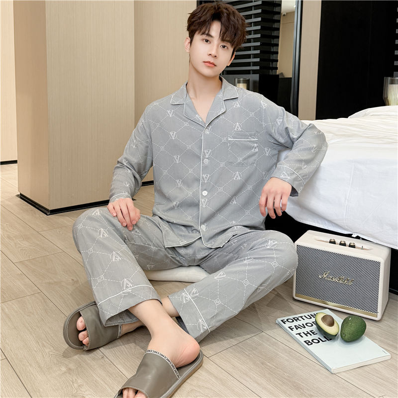 Главная страница > Хлопково-шелковые пижамы мужские весенне-осенние с длинными рукавами большого размера, элитный костюм, летняя домашняя одежда в клетку с тонкими лацканами и принтом