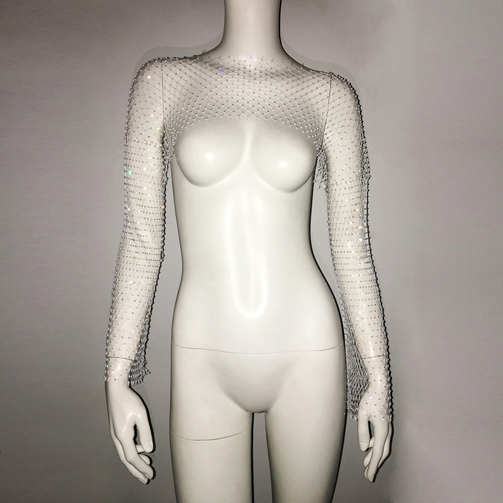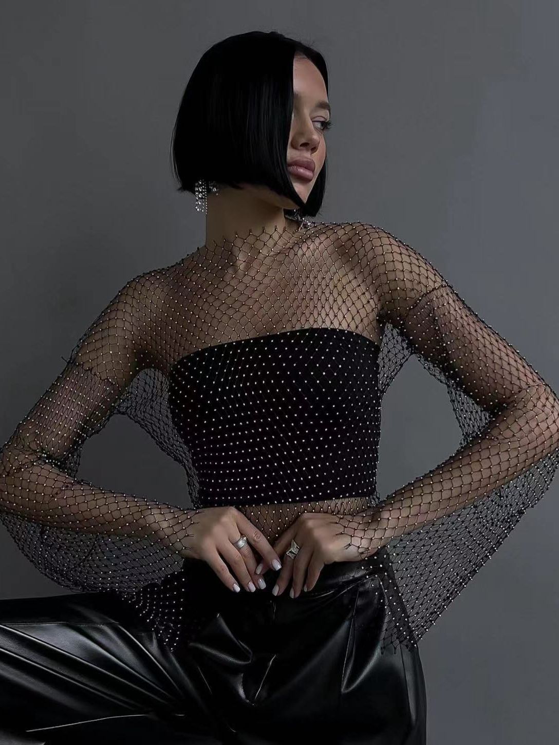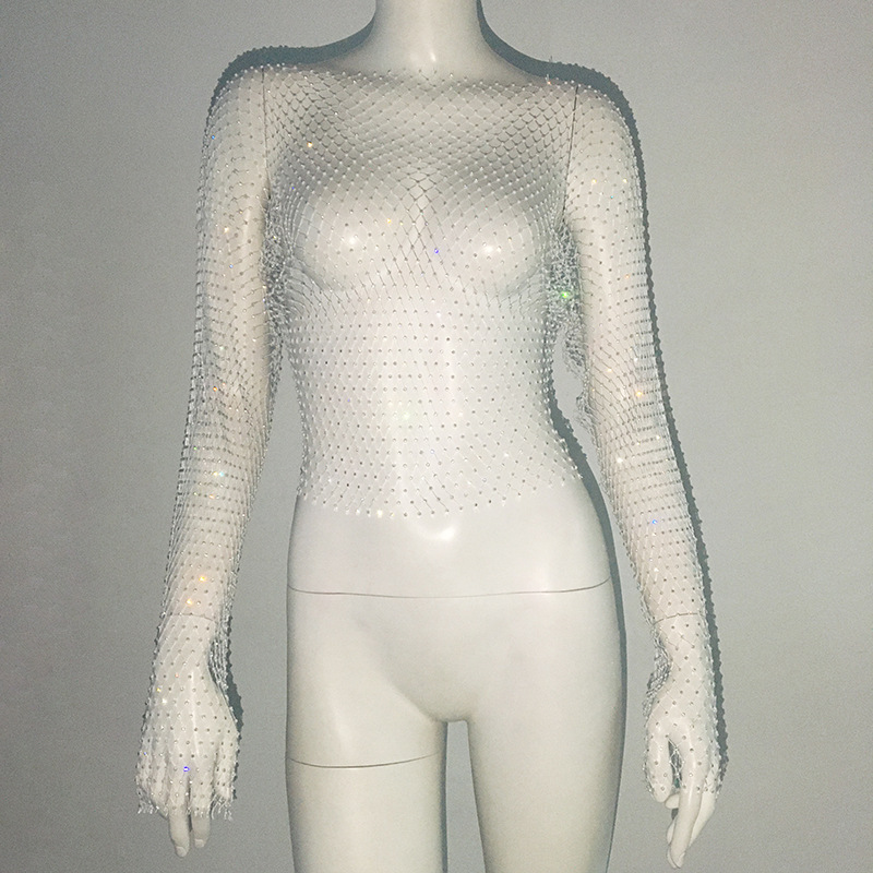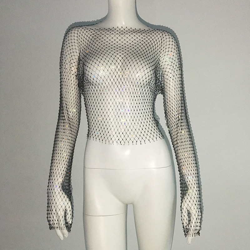 Главная страница > Европейская и американская летняя старшая мода женская сетка со стразами с длинными рукавами футболка горячая девушка топ женская рыболовная сетка нижняя рубашка t