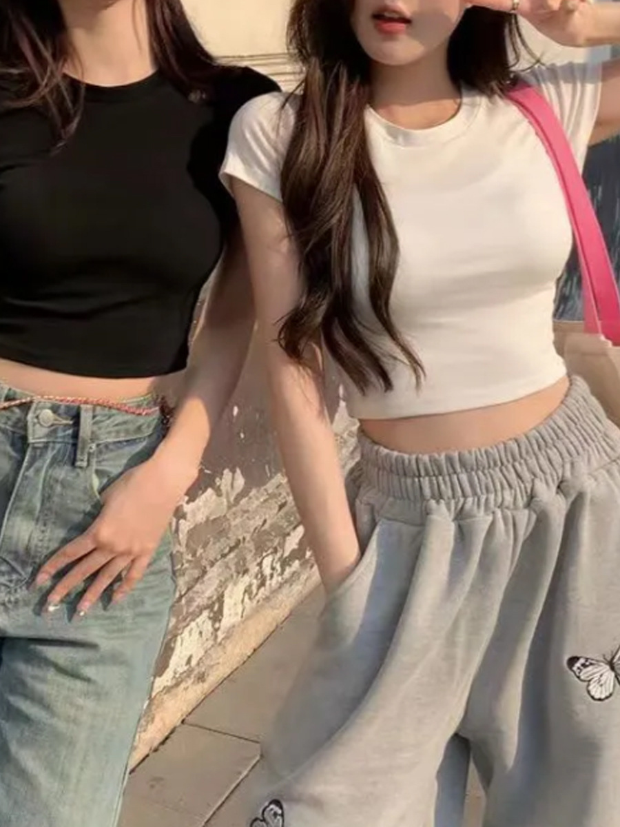 Главная страница > Белая футболка с открытым пупком, женская летняя футболка с короткими рукавами, новый облегающий сексуальный короткий топ с открытым пупком, однотонная нижняя рубашка
