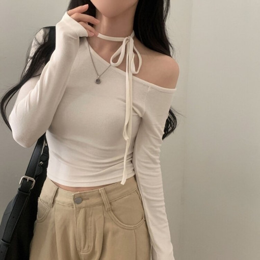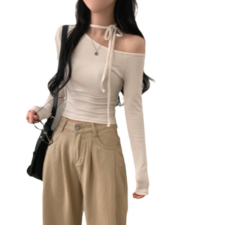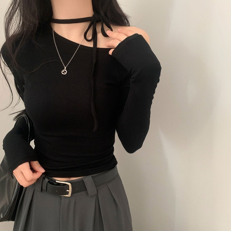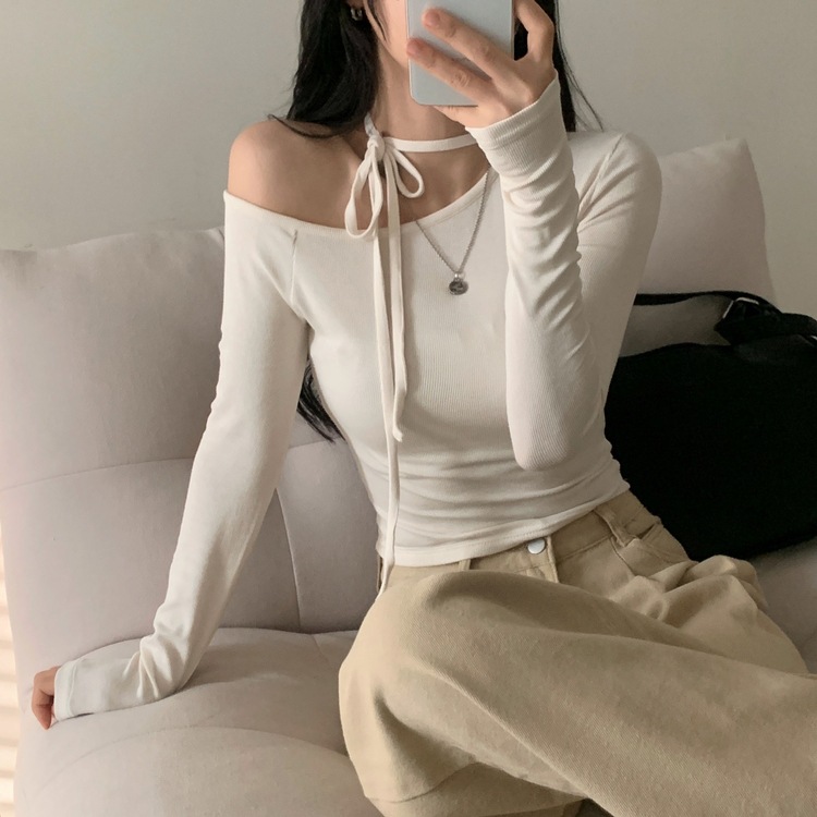 Главная страница > Корейская шикарная осенняя нишевая сексуальная женская футболка с открытой ключицей на шнуровке и длинными рукавами с облегающим топом