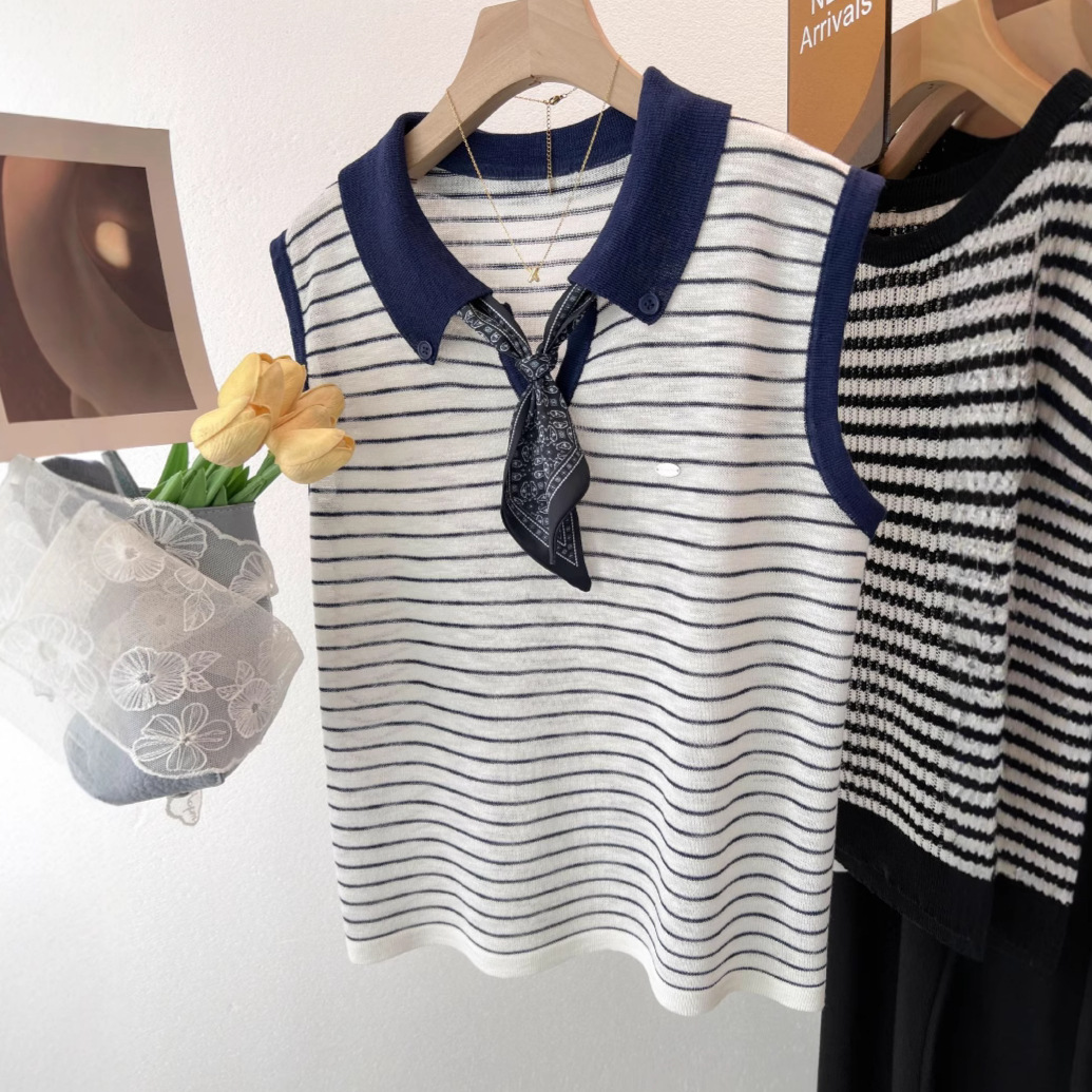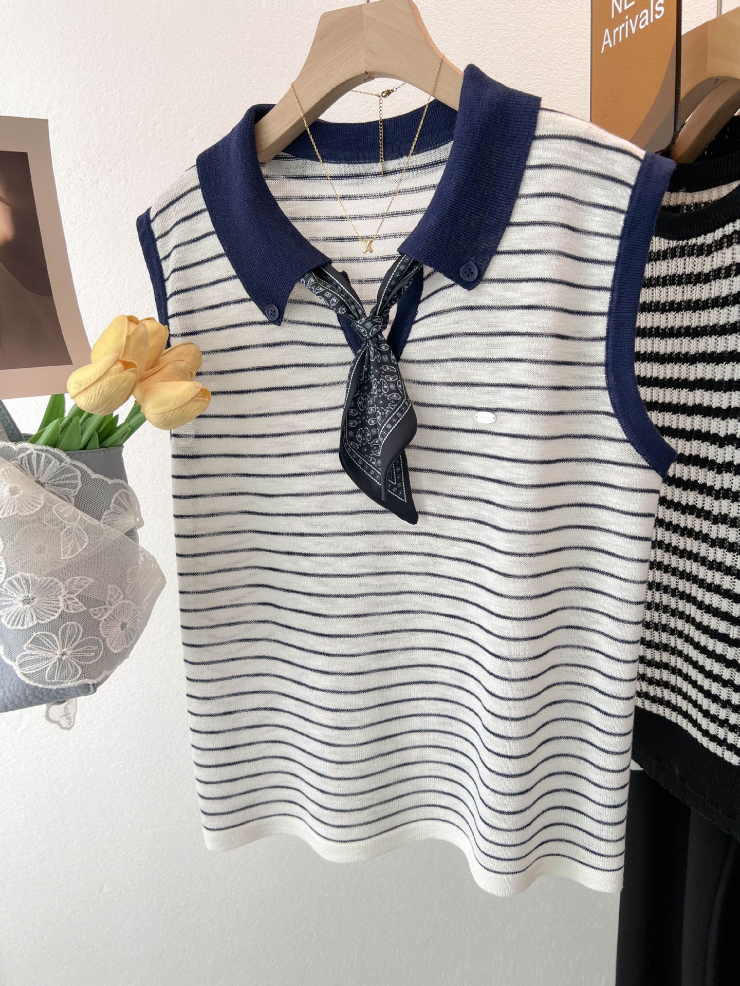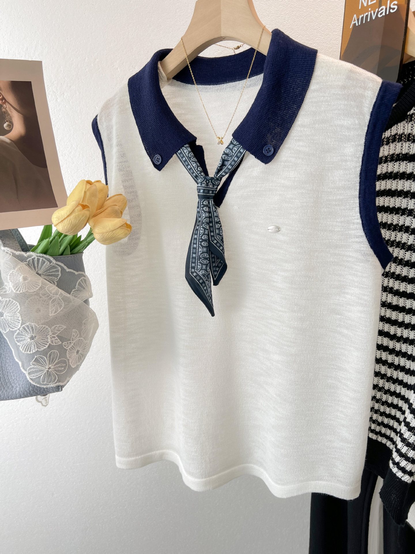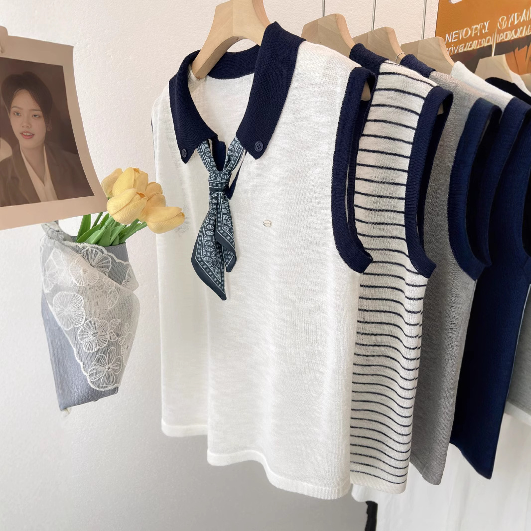 Главная страница > Настоящий снимок контрастного цвета, шелковый шарф с воротником-поло, полосатый трикотаж, топ без рукавов с лацканами, женская футболка с короткими рукавами, женская нижняя рубашка, женская рубашка