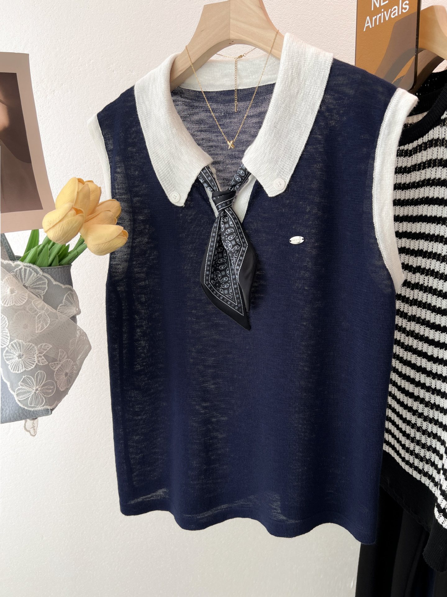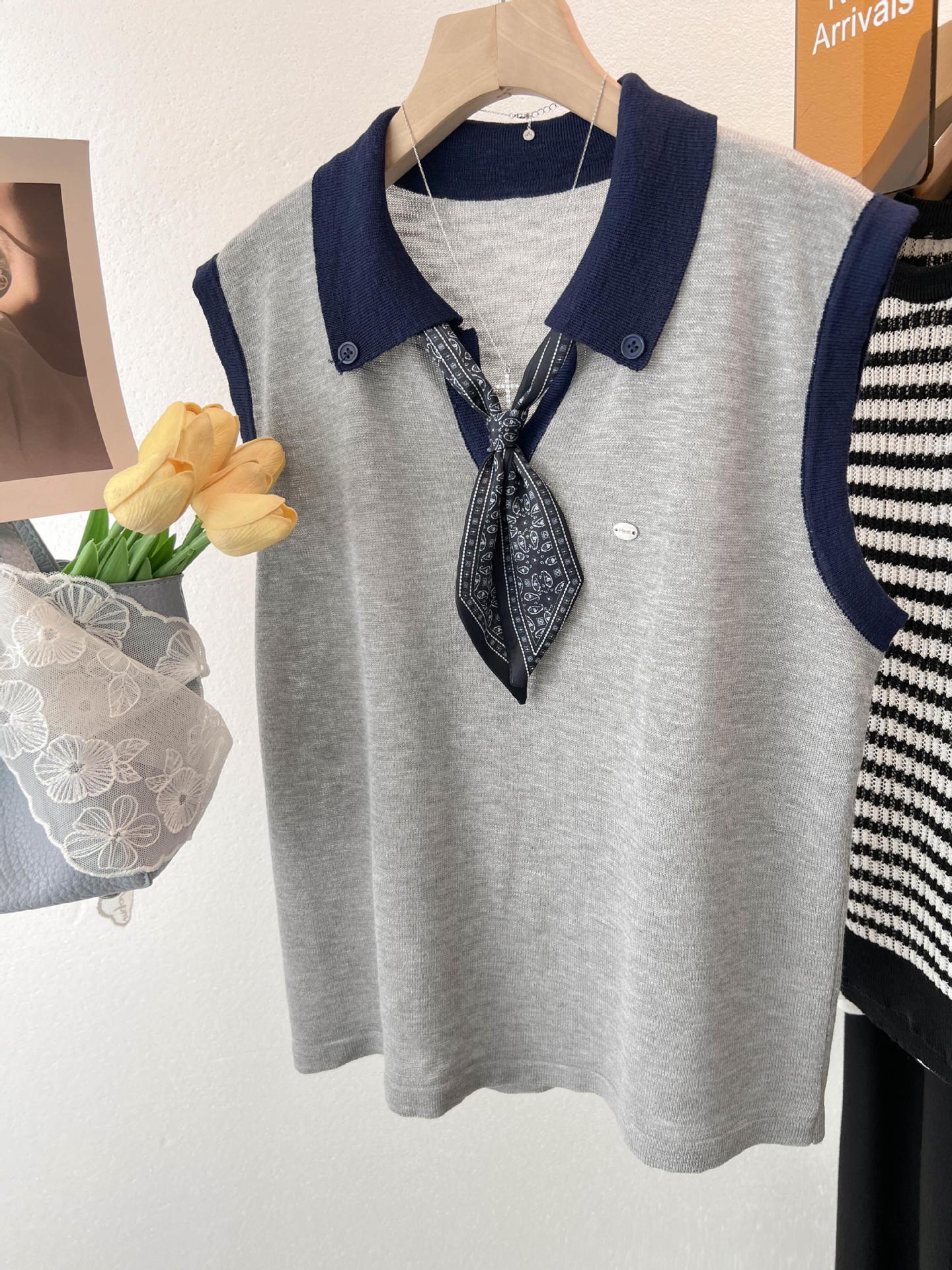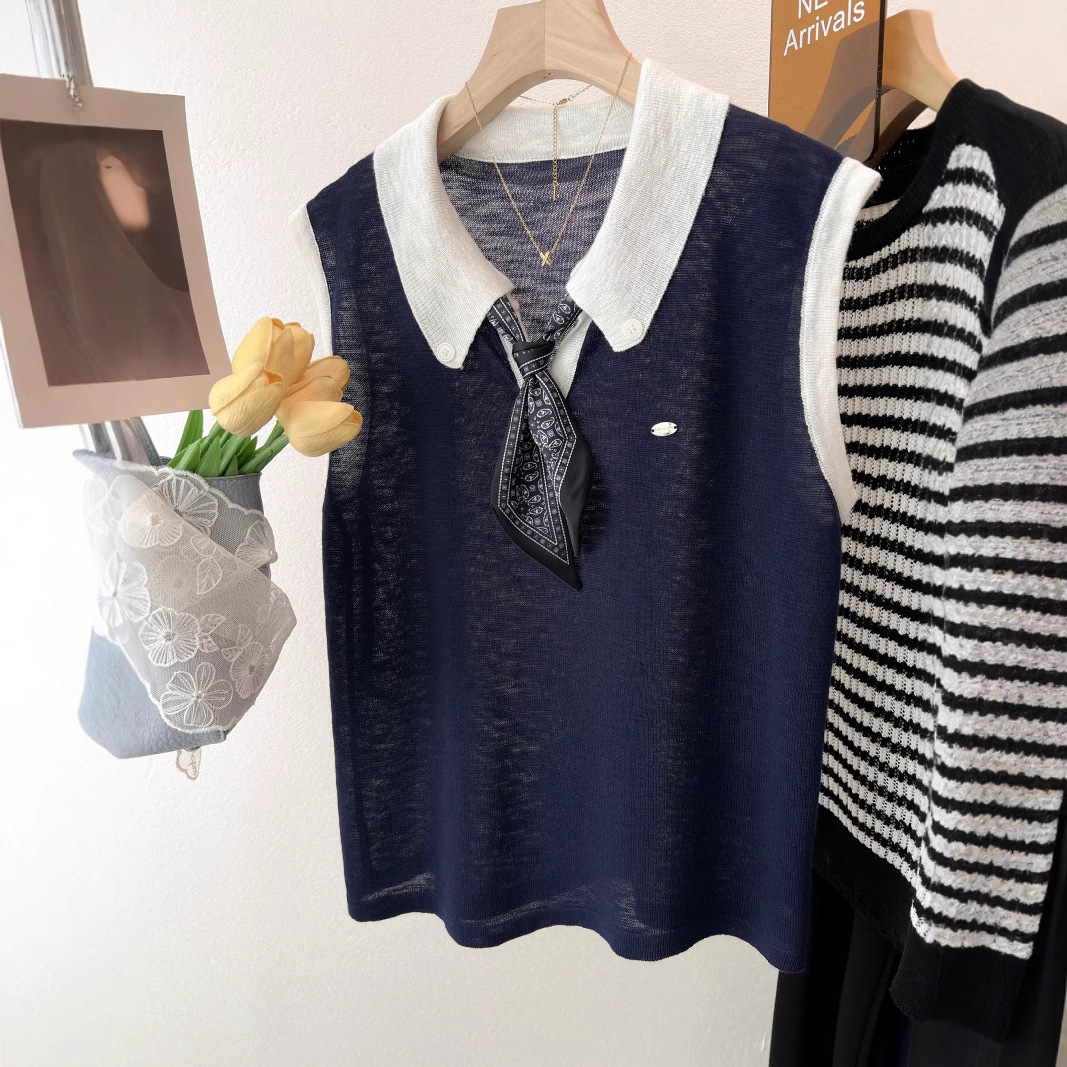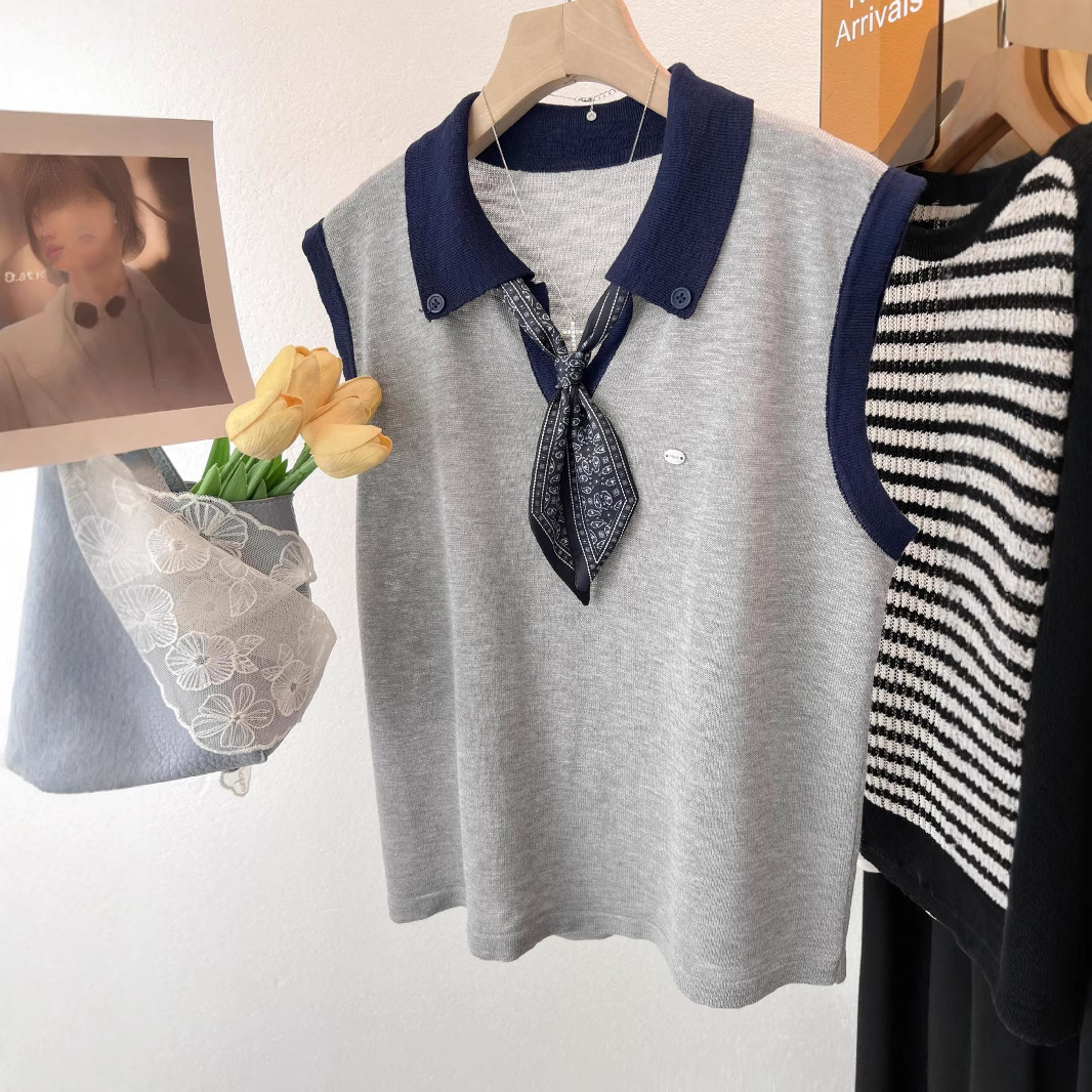 Главная страница > Настоящий снимок контрастного цвета, шелковый шарф с воротником-поло, полосатый трикотаж, топ без рукавов с лацканами, женская футболка с короткими рукавами, женская нижняя рубашка, женская рубашка