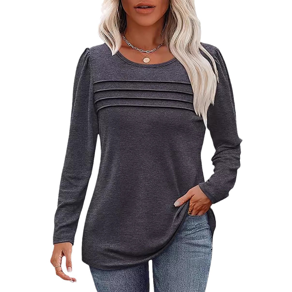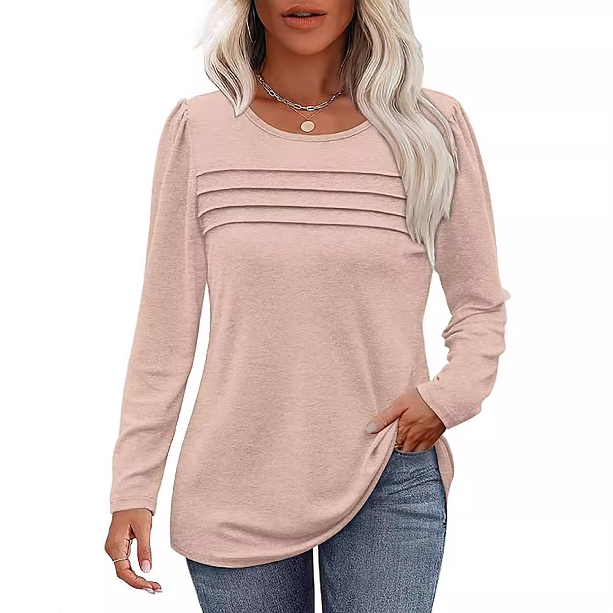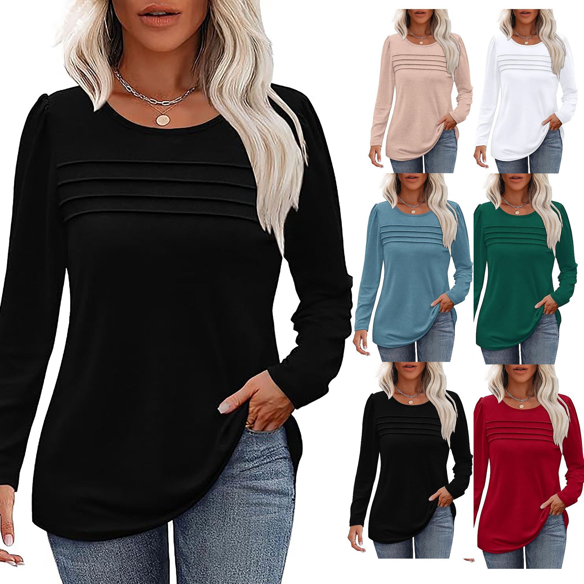 Главная страница > Amazon Independent Station 2025 Европейские и американские трансграничные осенне-зимние новые женские свободные плиссированные футболки с длинными рукавами и круглым вырезом, топы