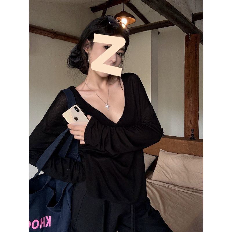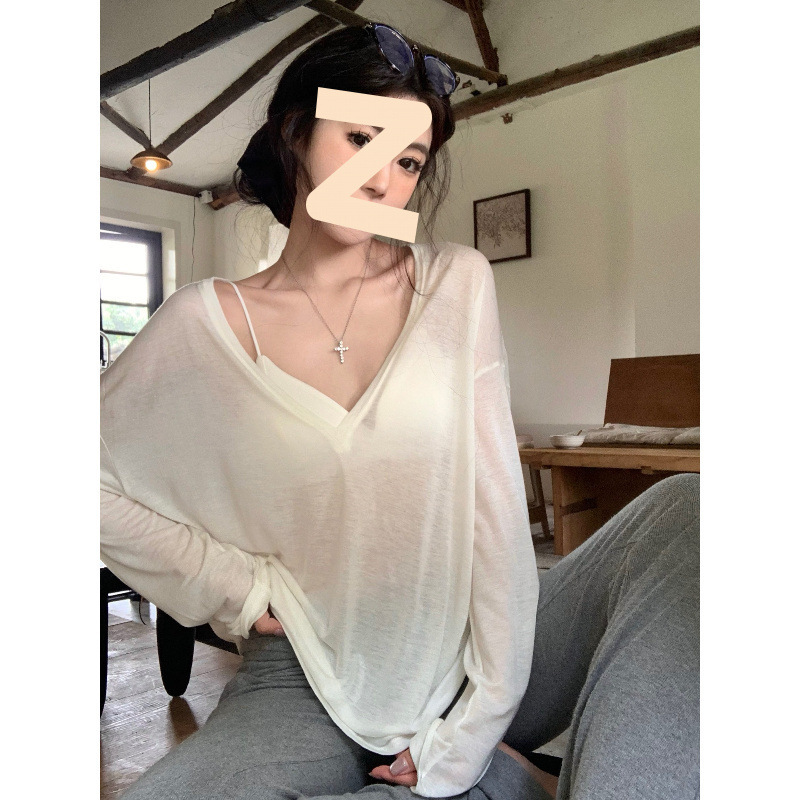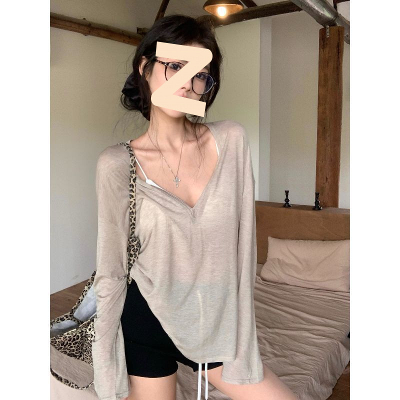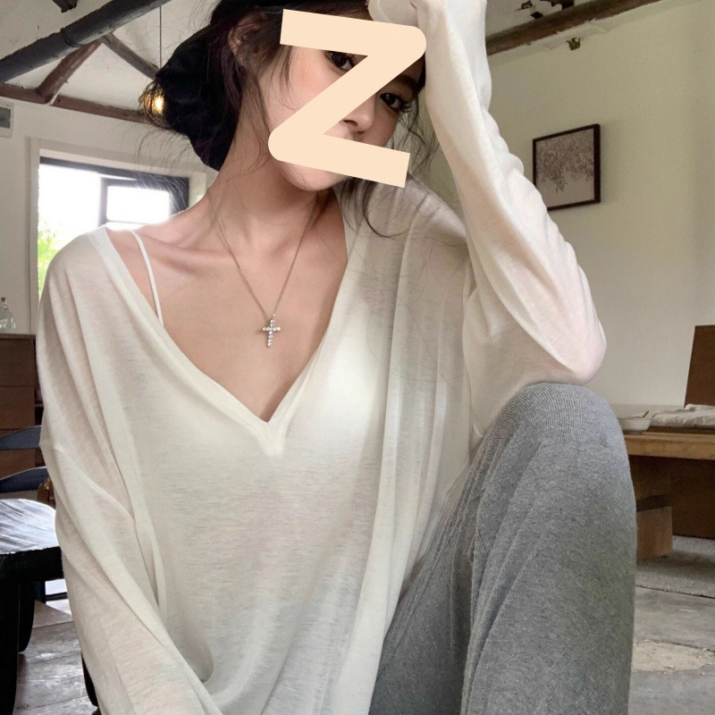 Главная страница > Свободная солнцезащитная блузка в ленивом стиле для женщин, летняя тонкая, слегка прозрачная футболка из ледяного шелка с длинными рукавами, элегантный топ с v-образным вырезом