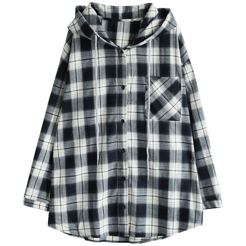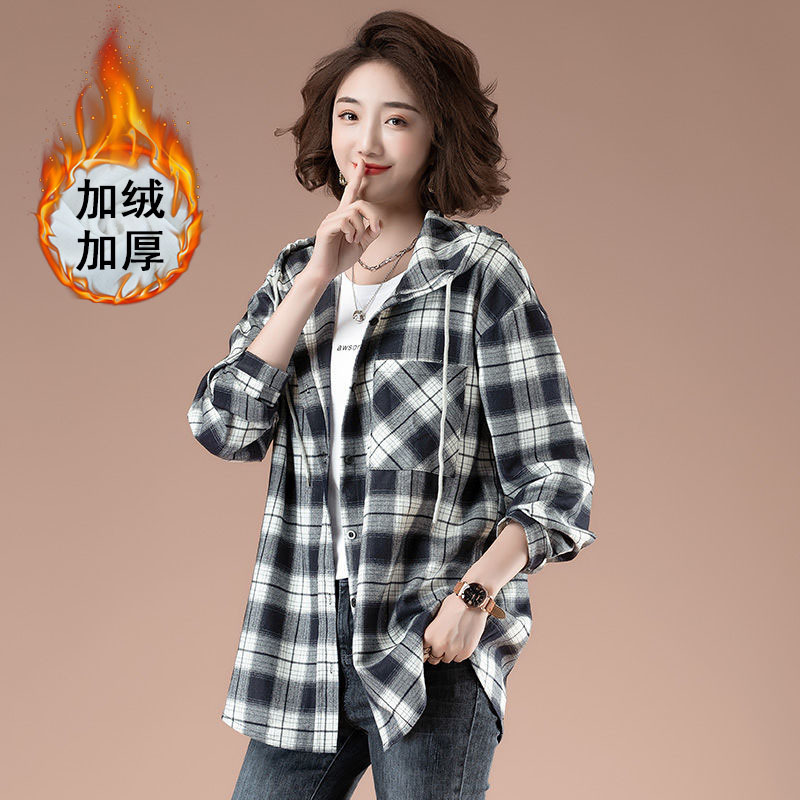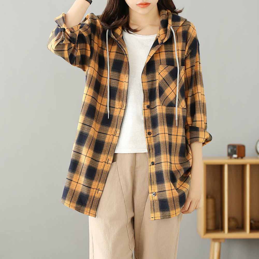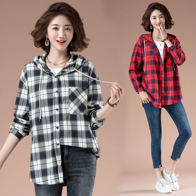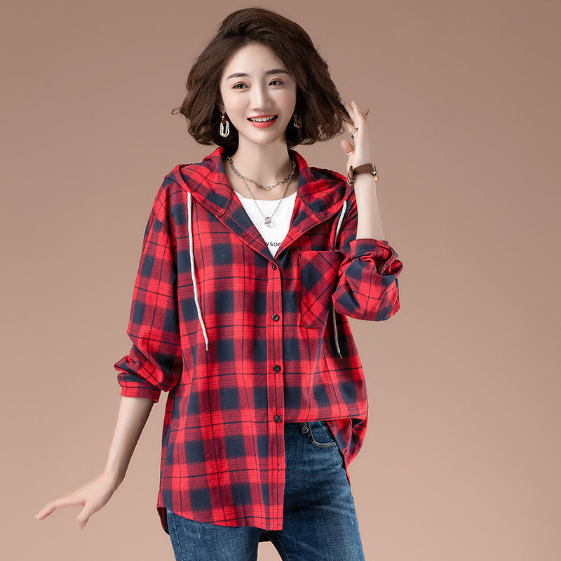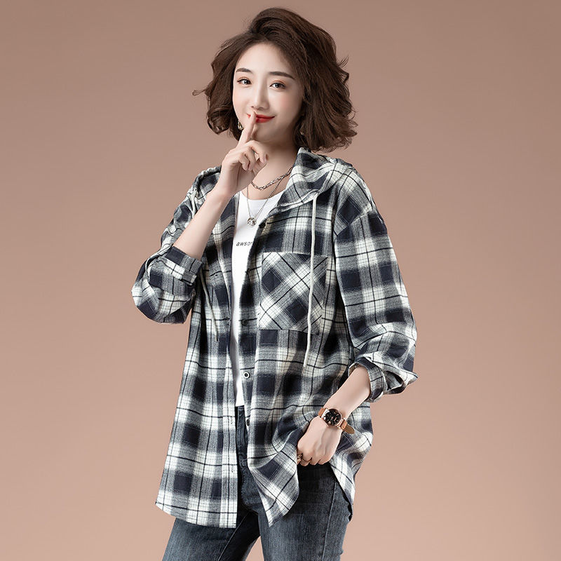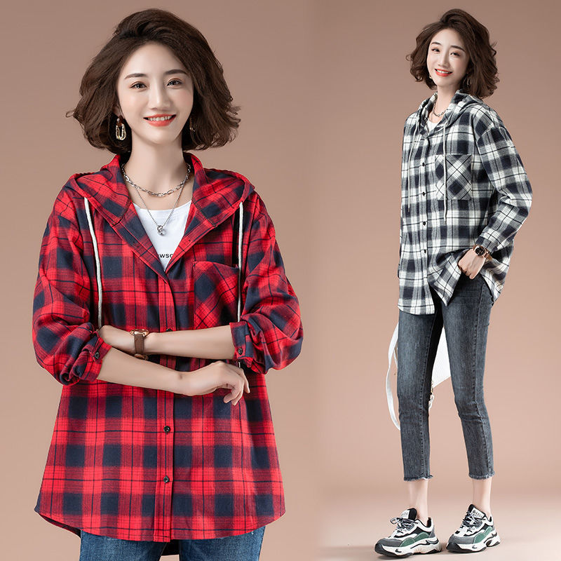 Главная страница > Клетчатая рубашка с капюшоном Женская свободная Ретро рубашка с длинным рукавом в Корейском стиле 2024 года, новая весенняя рубашка средней длины в западном стиле, женская мода