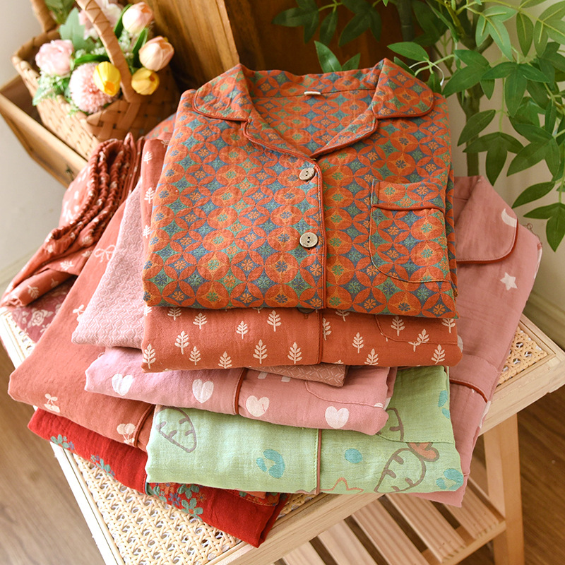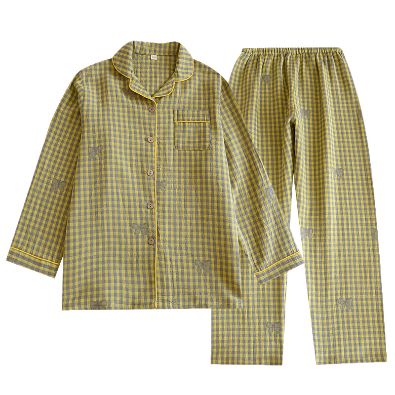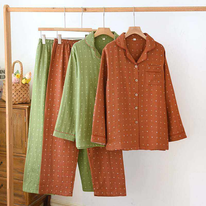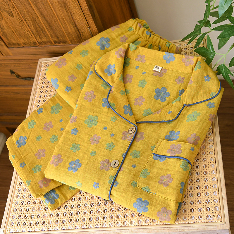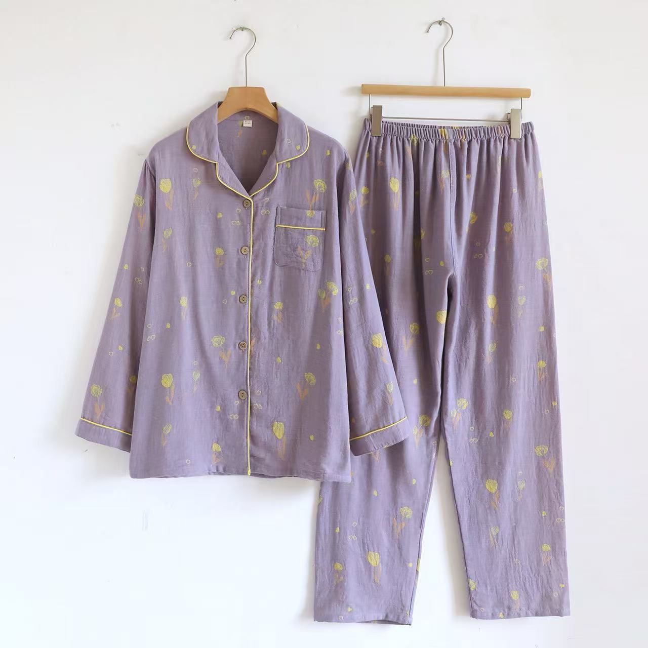 Хлопок большой жаккард двухслойная пряжа женская домашняя одежда пижама с длинными рукавами брюки костюм цвета трикотажный отливок можно носить в любое время года