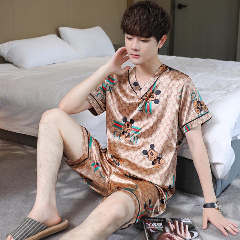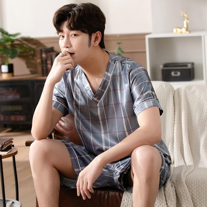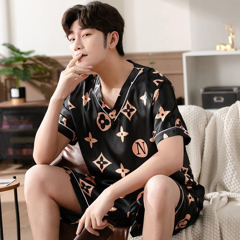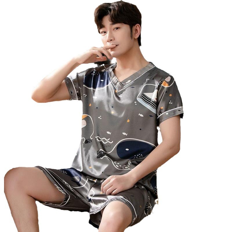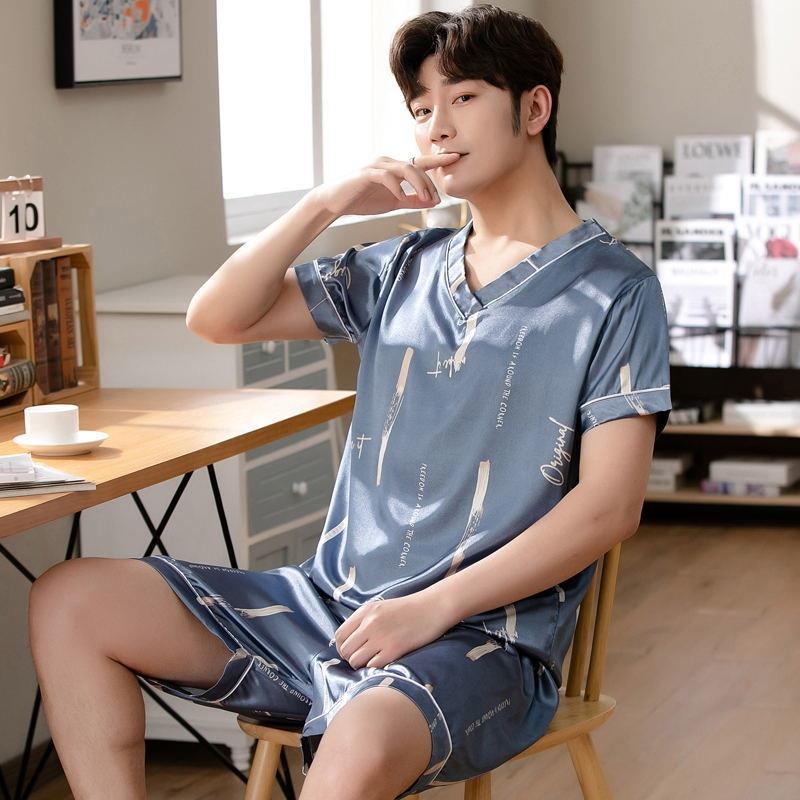 Главная страница > Тонкий костюм из ледяного шелка с короткими рукавами из двух предметов в Корейском стиле, свободная Мужская домашняя одежда из ледяного шелка, пижамы для мужчин на лето