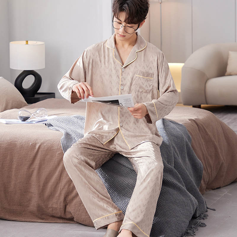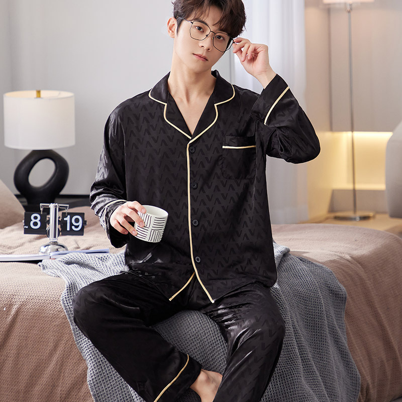 Пижама мужской ледяной шелк весной и осенью тонкий длинный рукав повседневный большой V может носить домашнюю одежду мужской летний шелковый костюм