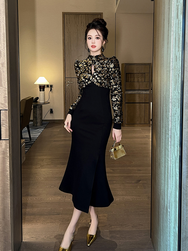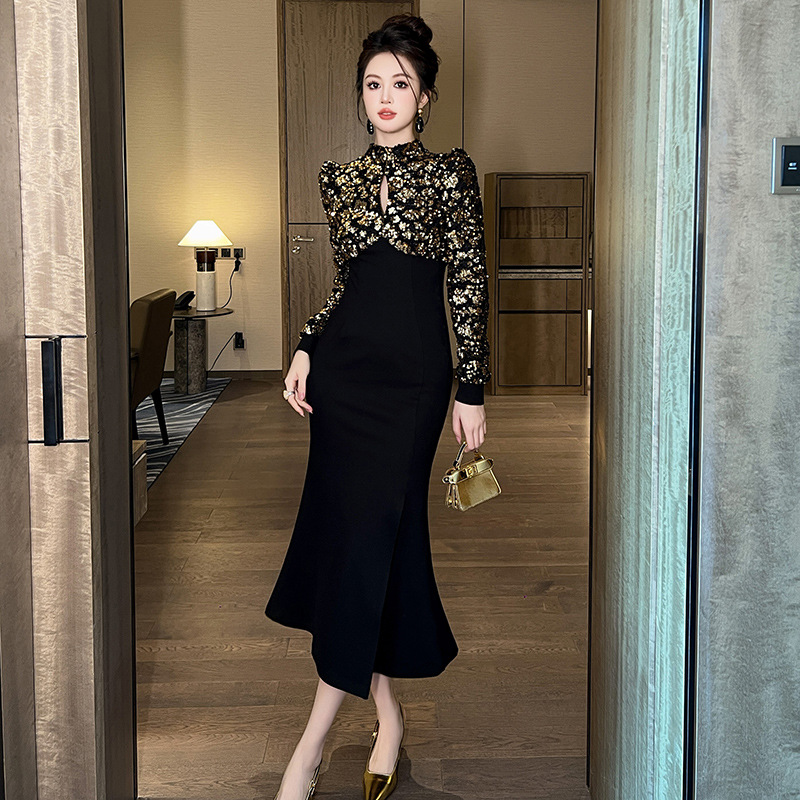 Главная страница > Новое осеннее черное платье 2025 года с завышенной талией и разрезом, женское длинное платье с пайетками для рождественской вечеринки и торжественных мероприятий, модель 91447
