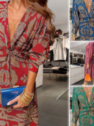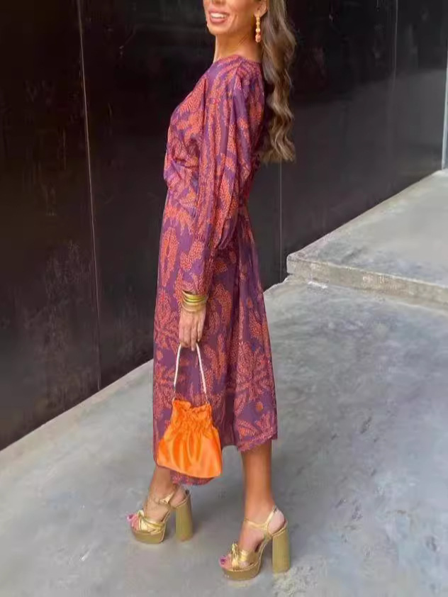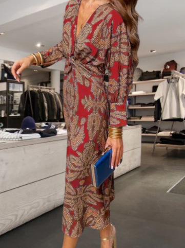Главная страница > Трансграничная внешняя торговля 2024 Amazon Independent Station wish осень новый печатный V-образный вырез среднего длинного платья женский