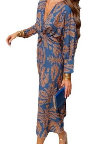 Трансграничная внешняя торговля 2024 Amazon Independent Station wish осень новый печатный V-образный вырез среднего длинного платья женский