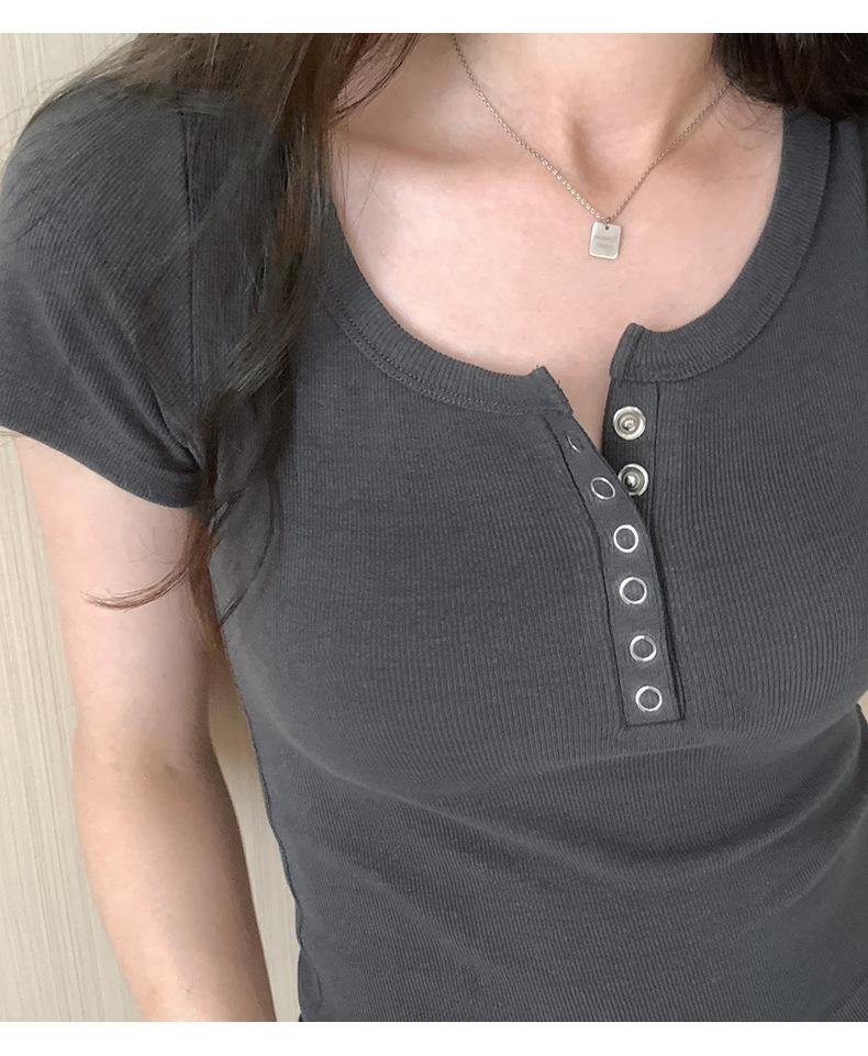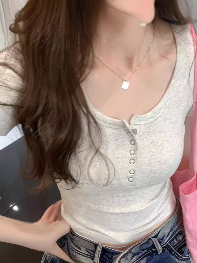 Главная страница > Футболка из резаного хлопка на пуговицах Женская короткая рубашка с короткими рукавами 2024 летом новый квадратный воротник дикий внешний вид тонкий топ