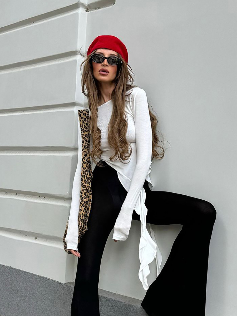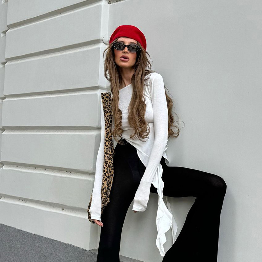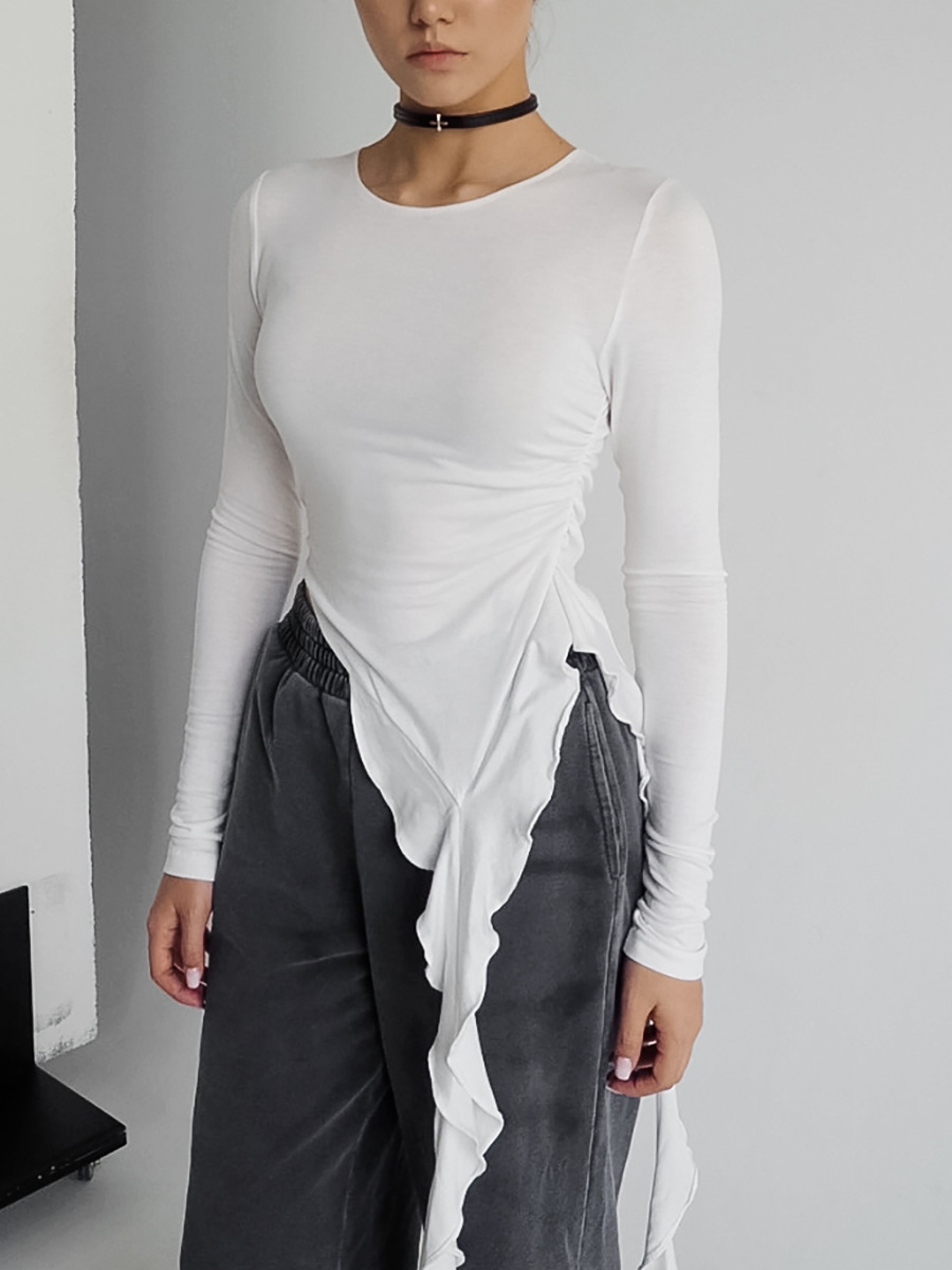 Главная страница > 2025 Русская весна/лето нерегулярный сексуальный дизайн белый вязаный круглый вырез тонкая женская футболка