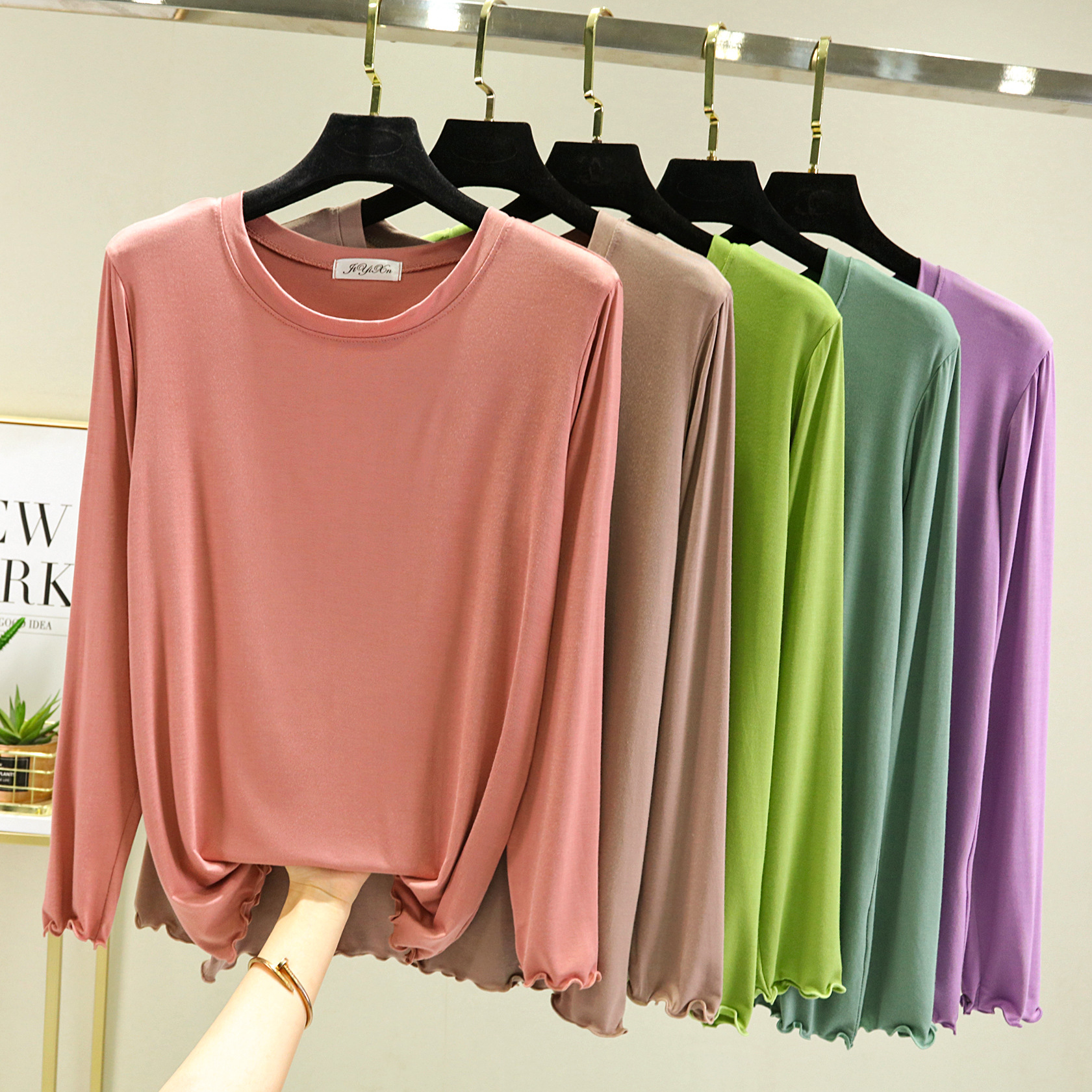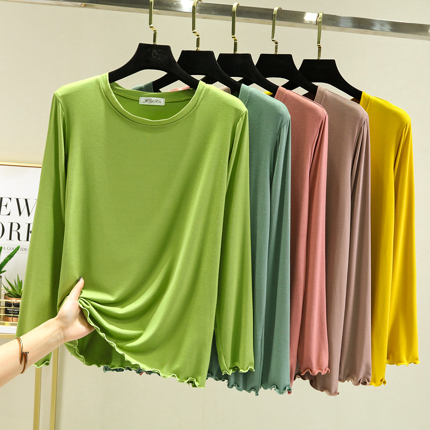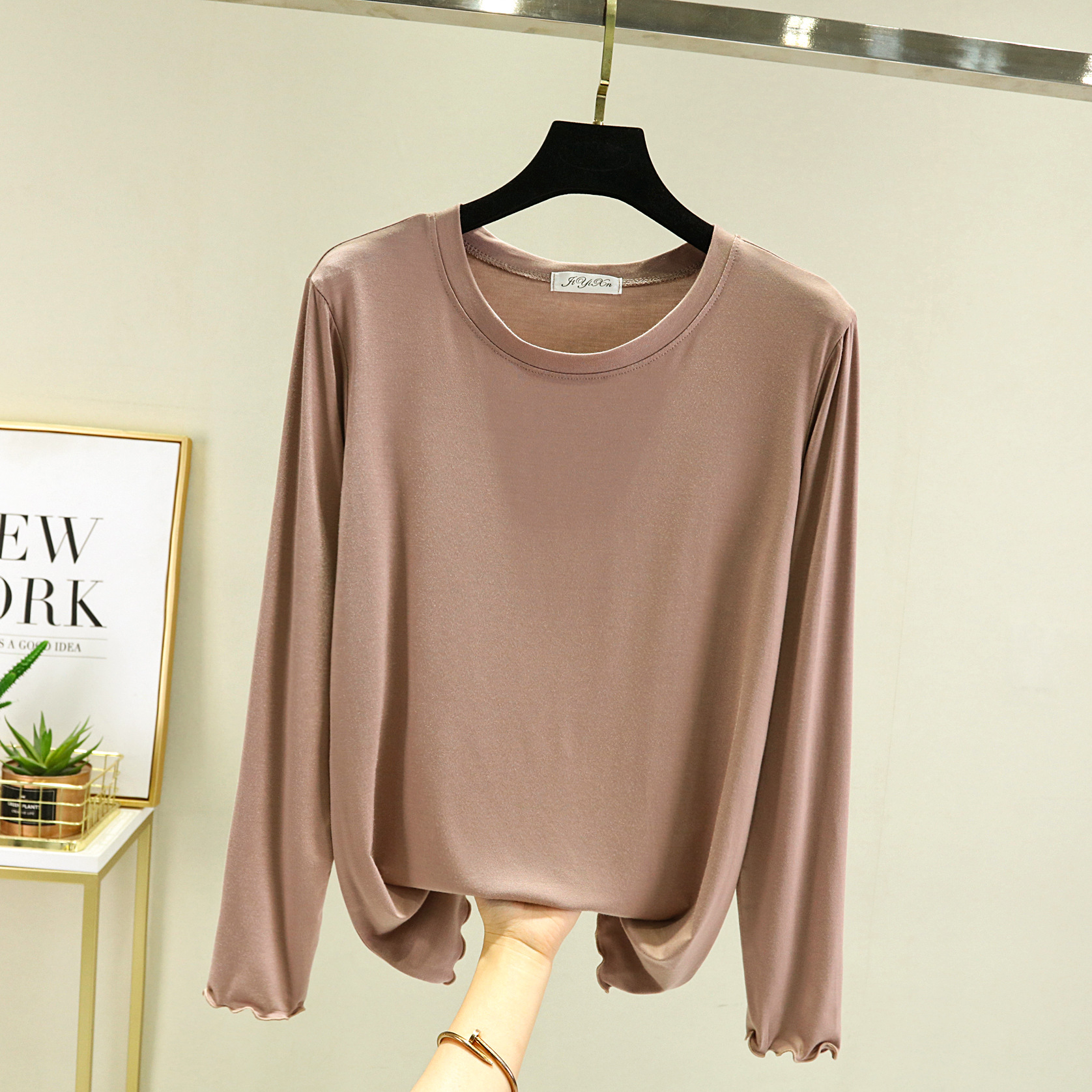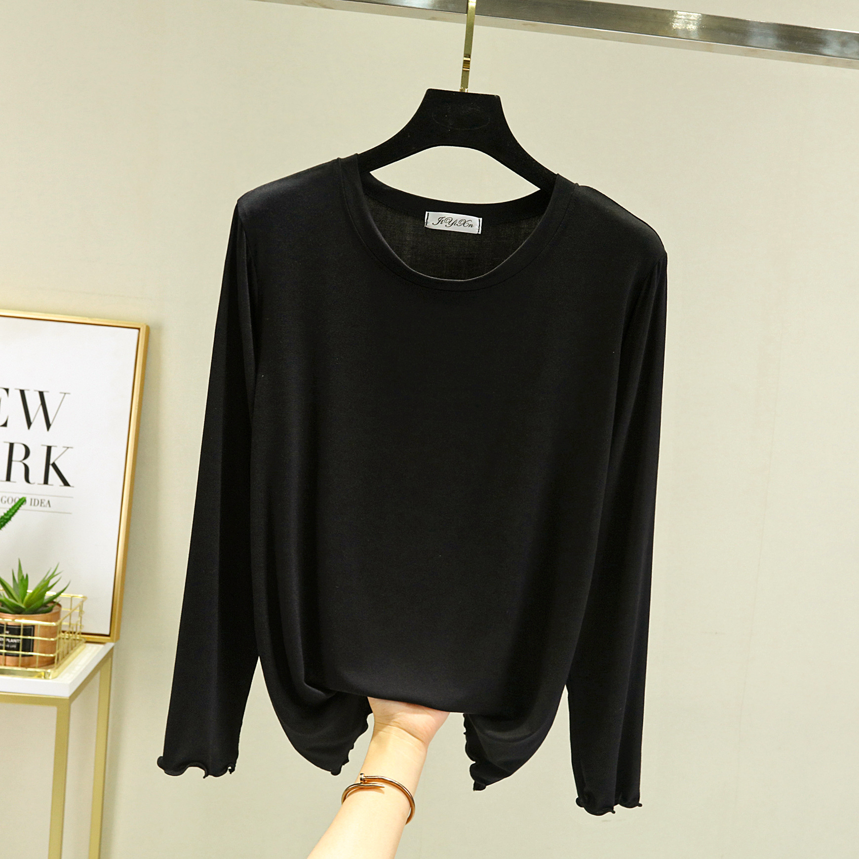 Главная страница > Модальная женская базовая футболка с облегающим кроем, новинка весны 2023, черная футболка с круглым вырезом и длинными рукавами.