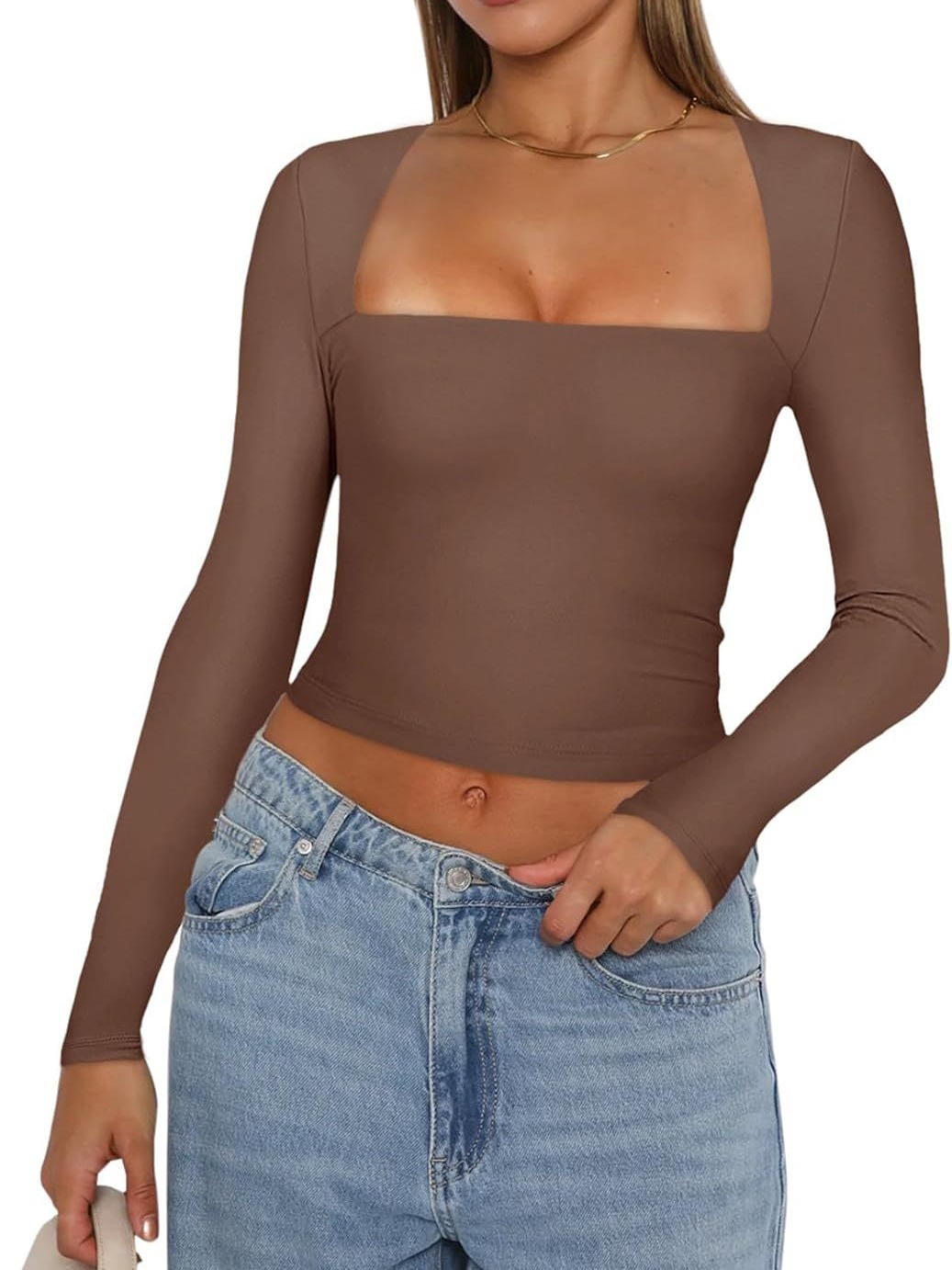 Главная страница > 2023 Европа и США трансграничная новая женская одежда Amazon AliExpress Горячие продажи с длинными рукавами сплошной цвет пупка с квадратным вырезом топ