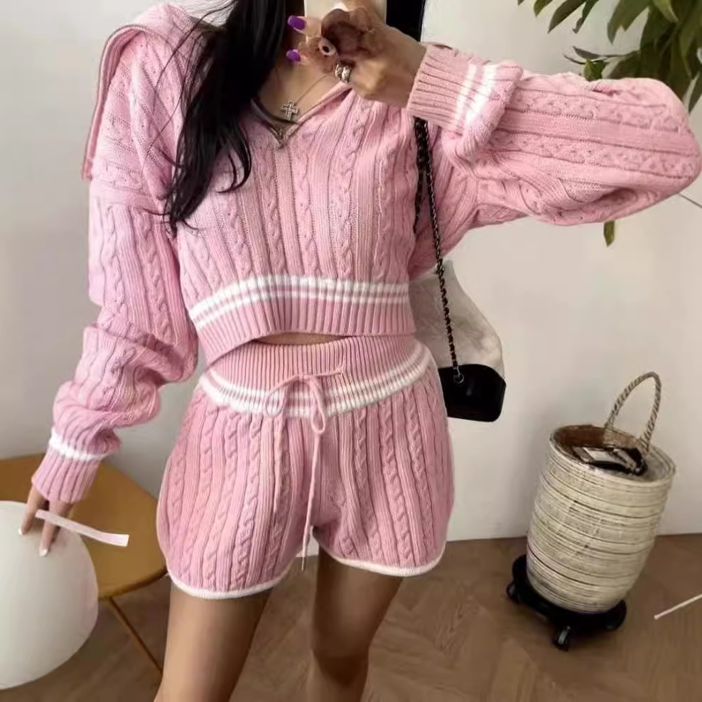 Модный женский комплект из толстого свитера на молнии и трикотажных шорт, новый стиль осень-зима 2025 года, двухслойный трикотажный комплект для женщин.