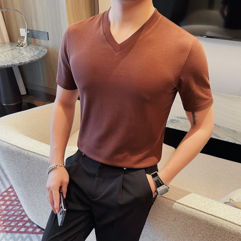2024 Летняя новая мужская мужская одежда легкий ветер V-образный вырез досуг тонкая повседневная простая футболка с короткими рукавами