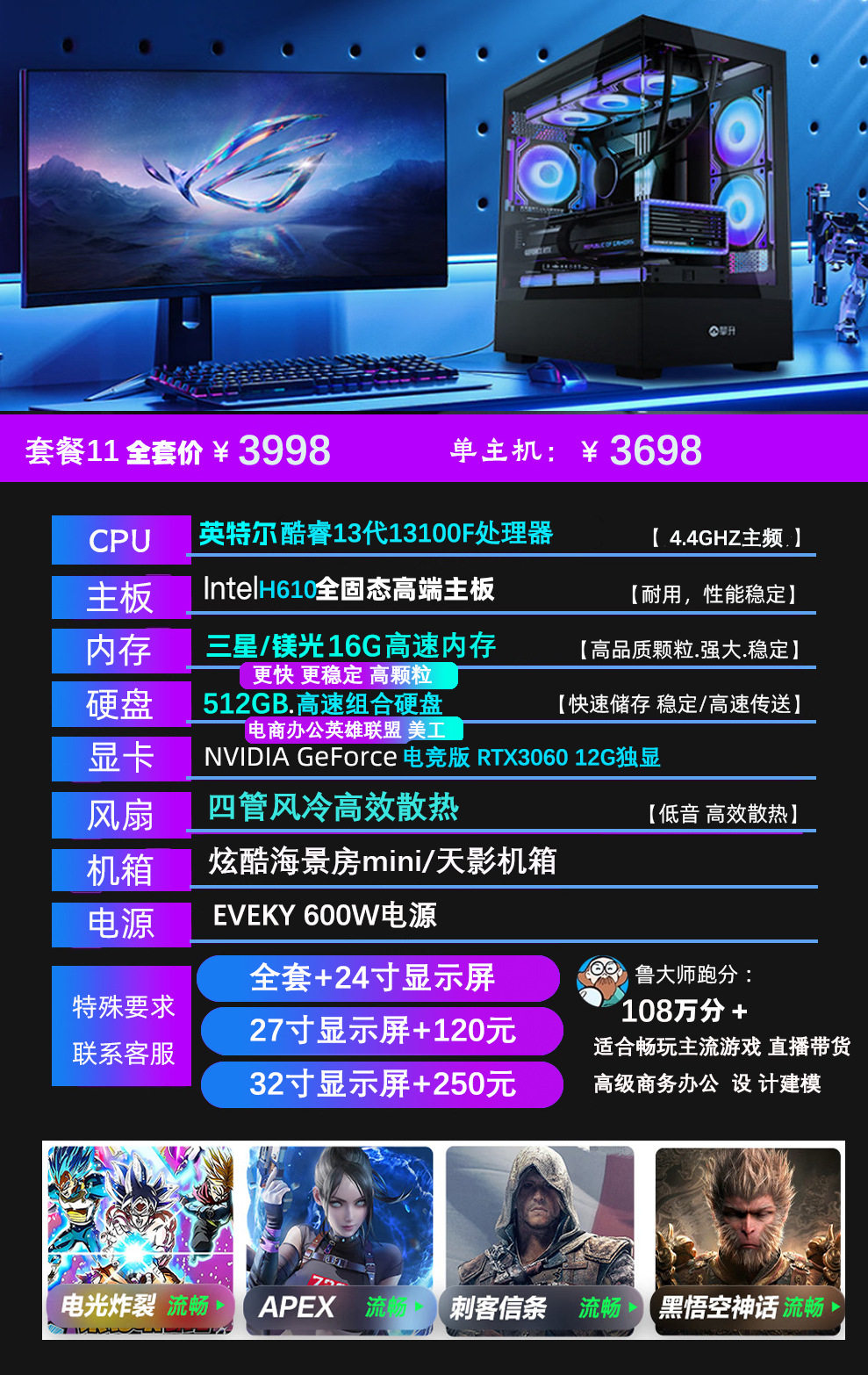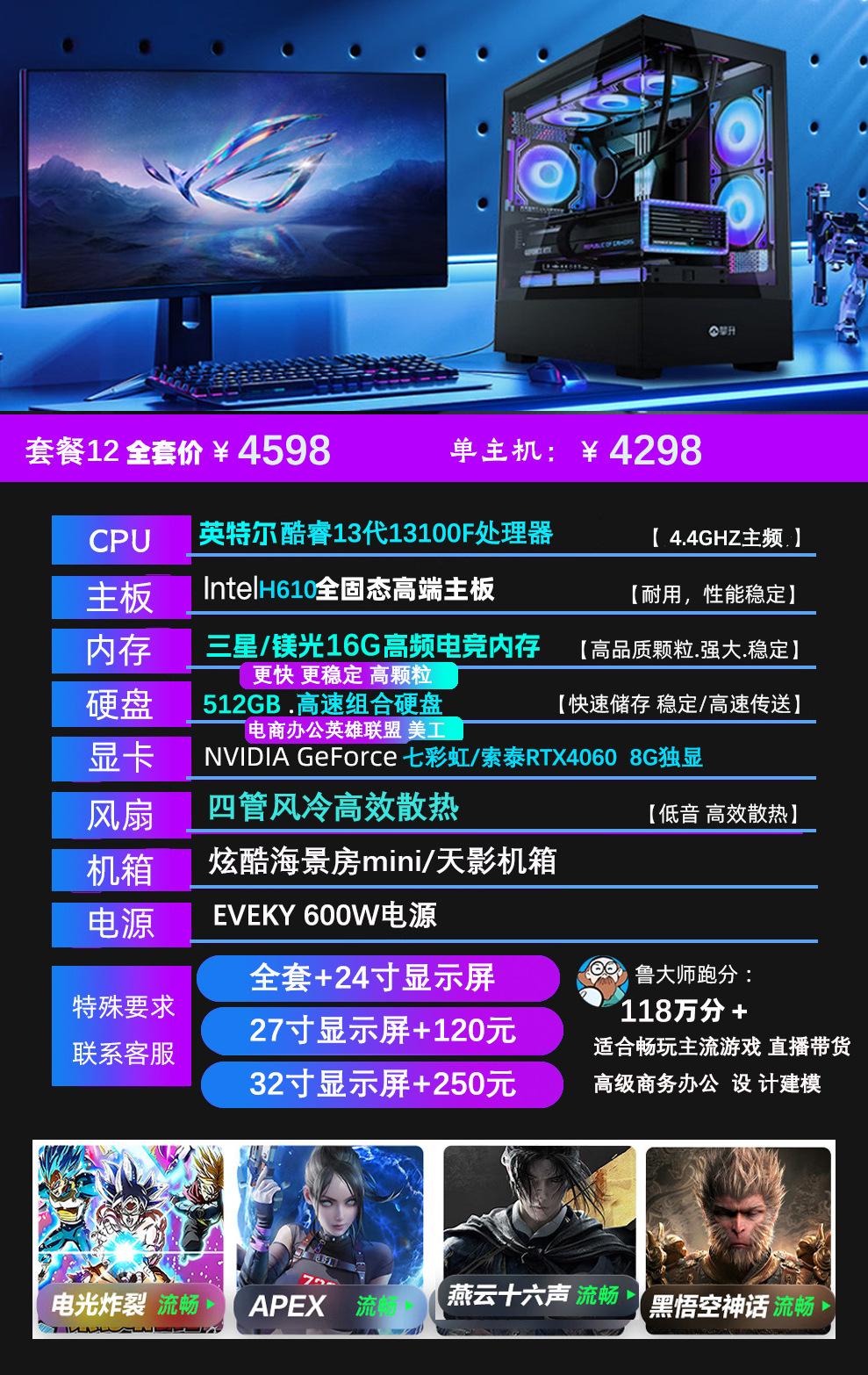 Компьютерный корпус MiKuten Core i7 24-ядерный с дискретной графикой RTX4060, для игр и офиса, черный (Black Myth)