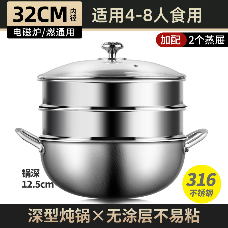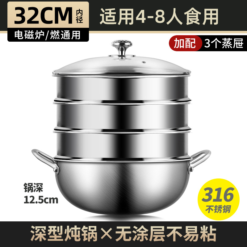 ☆★32 см с трехслойной пароваркой [316 стальная антипригарная кастрюля для тушения и приготовления пищи]☆★