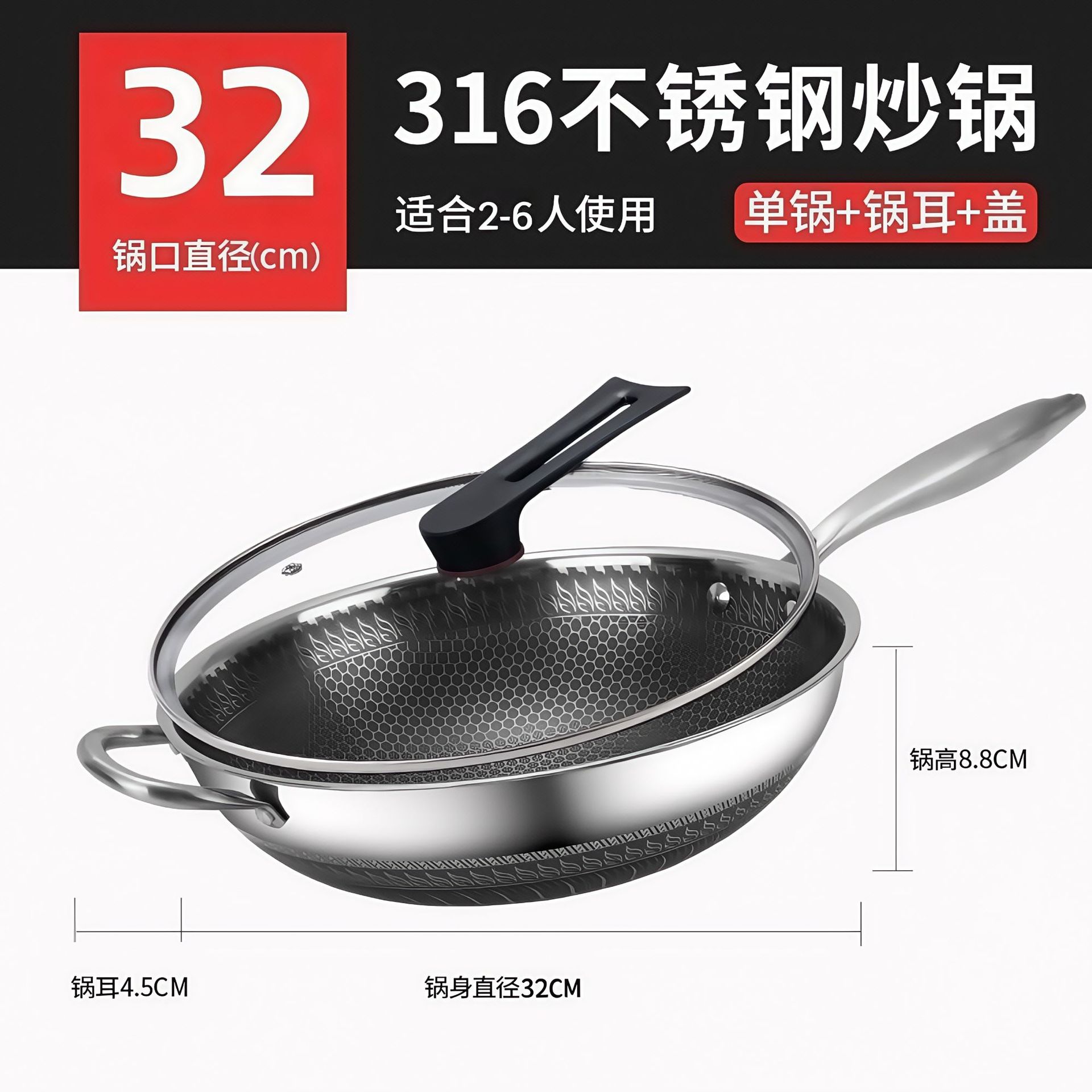 Односторонний цветочный вок диаметром 32 см с ушками и крышкой