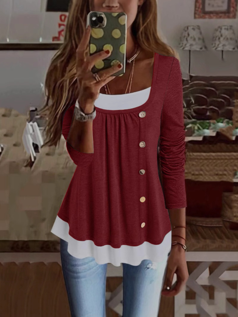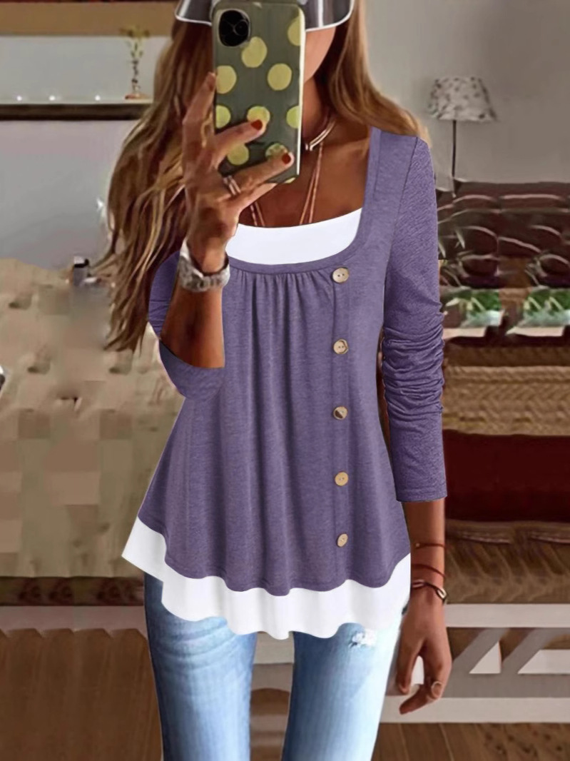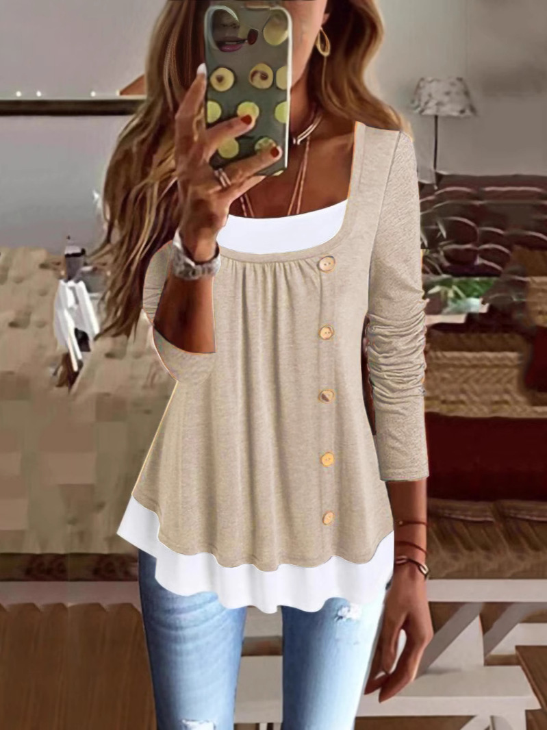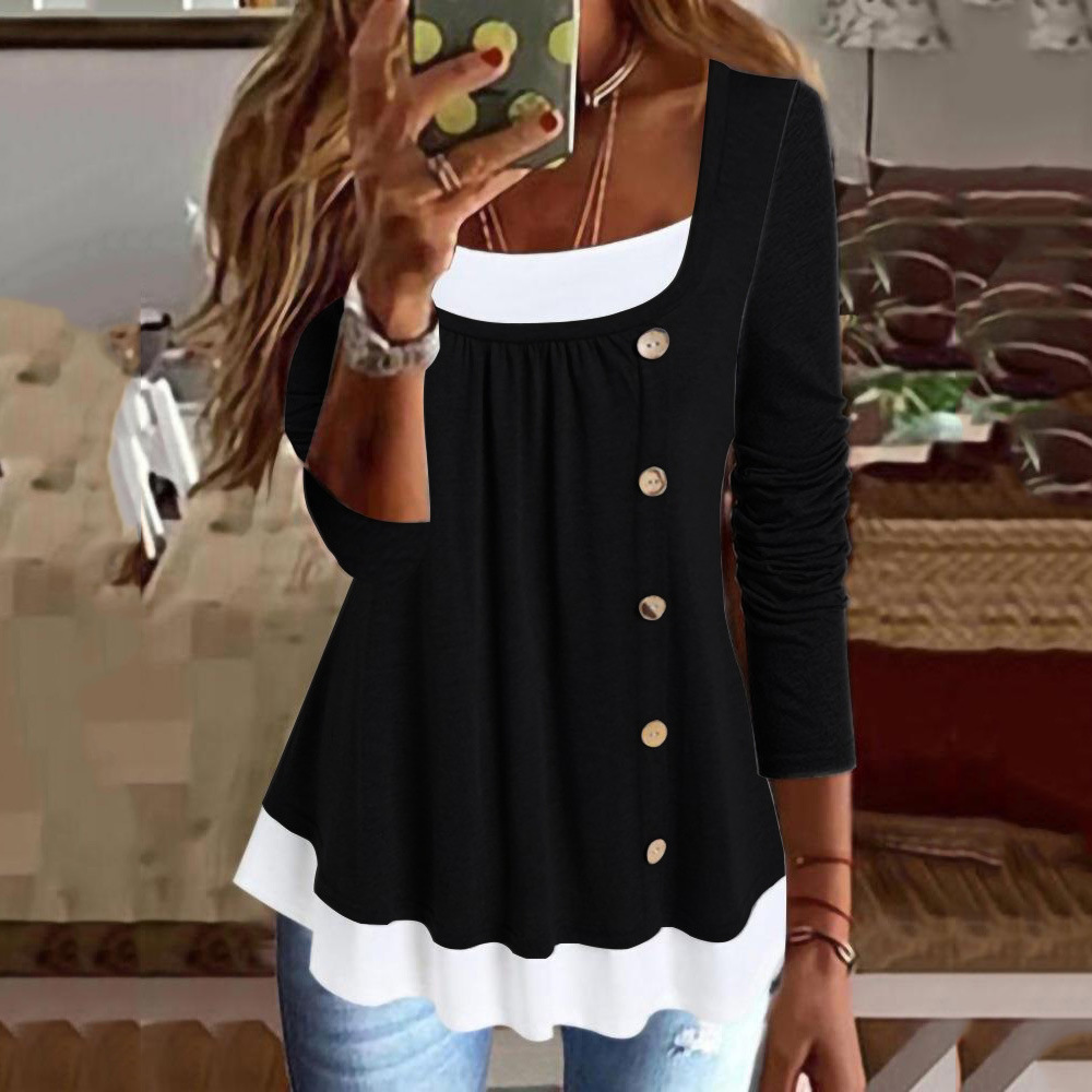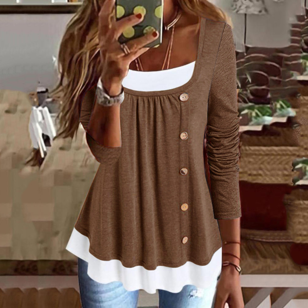 Главная страница > Женская футболка 2025 года, экспортная, кросс-бордерная, повседневная, с круглым вырезом, длинными рукавами, цветная, плиссированная, однотонная, на пуговицах.