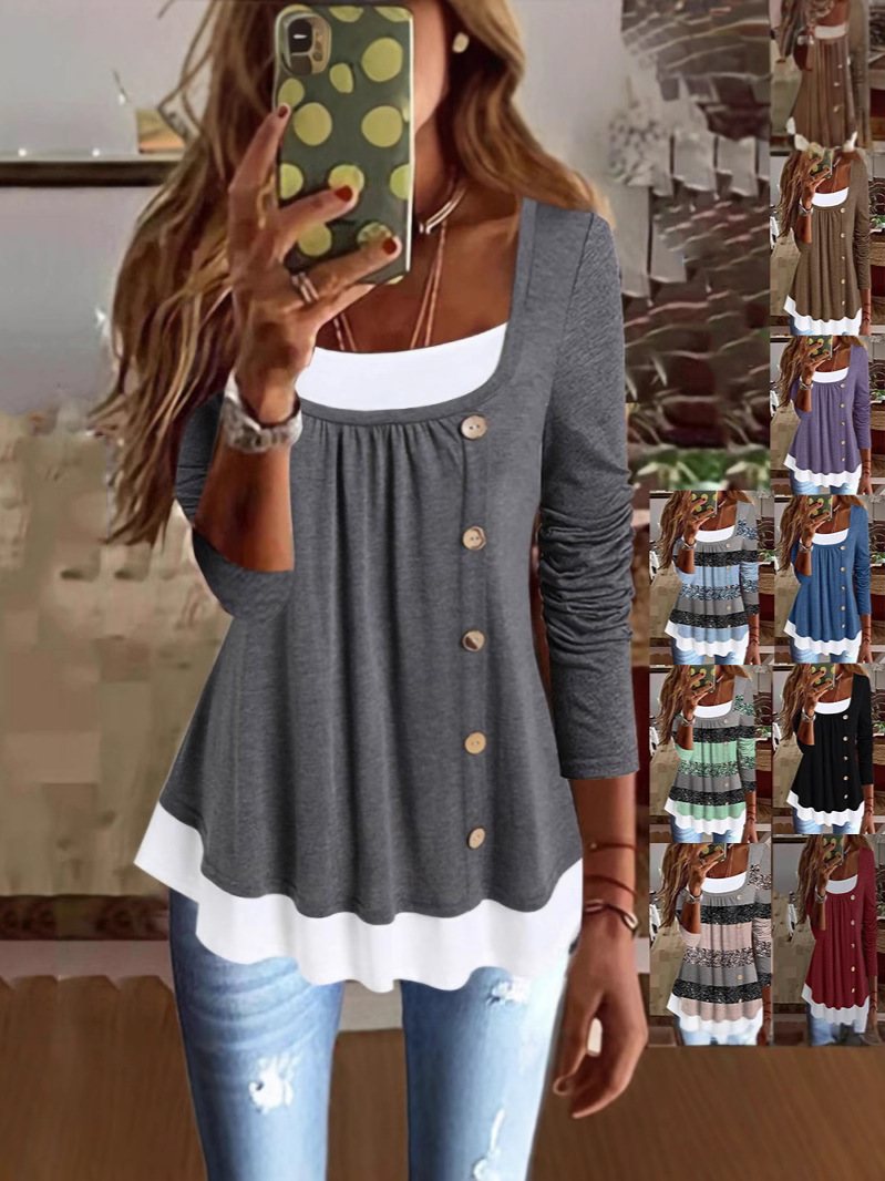 Женская футболка 2025 года, экспортная, кросс-бордерная, повседневная, с круглым вырезом, длинными рукавами, цветная, плиссированная, однотонная, на пуговицах.
