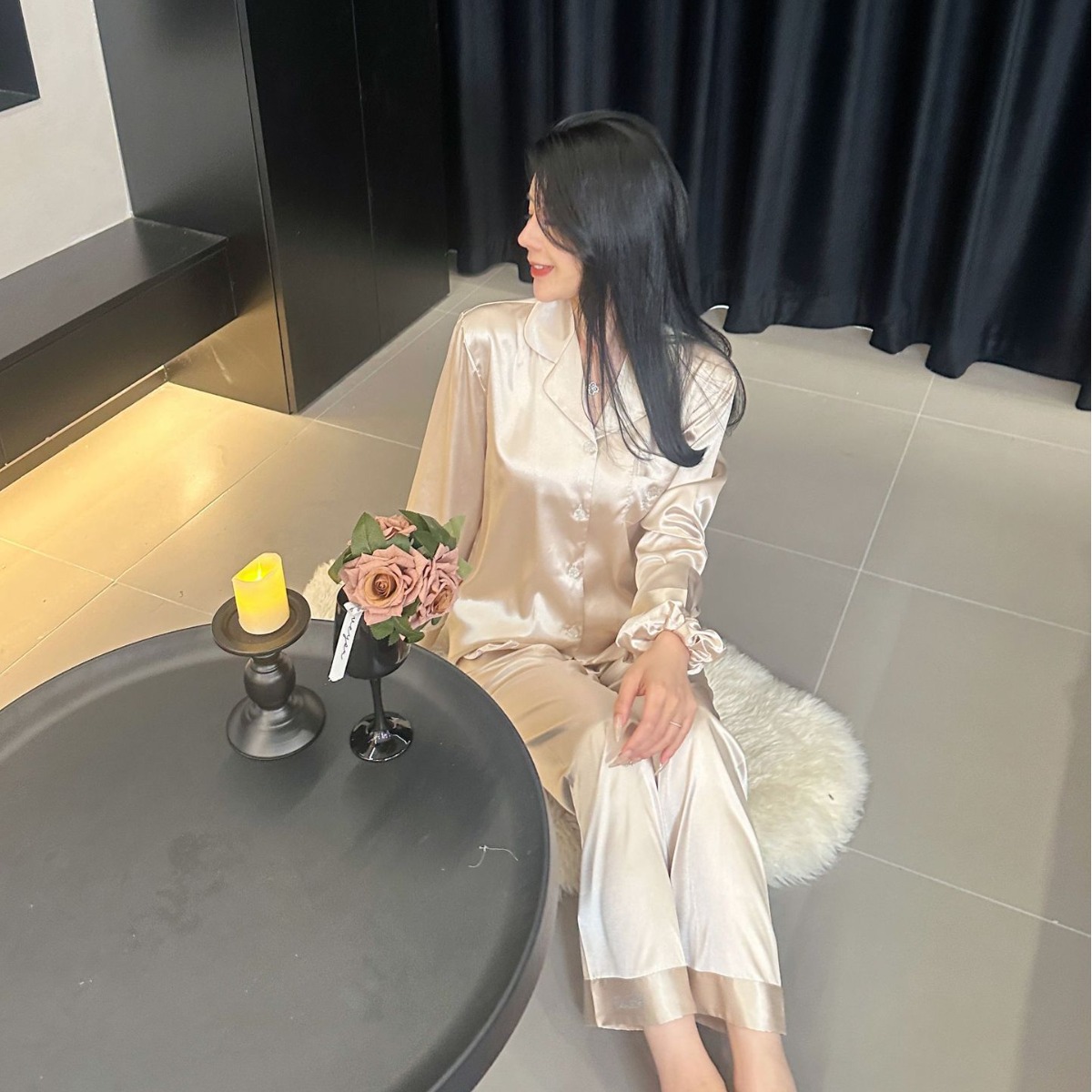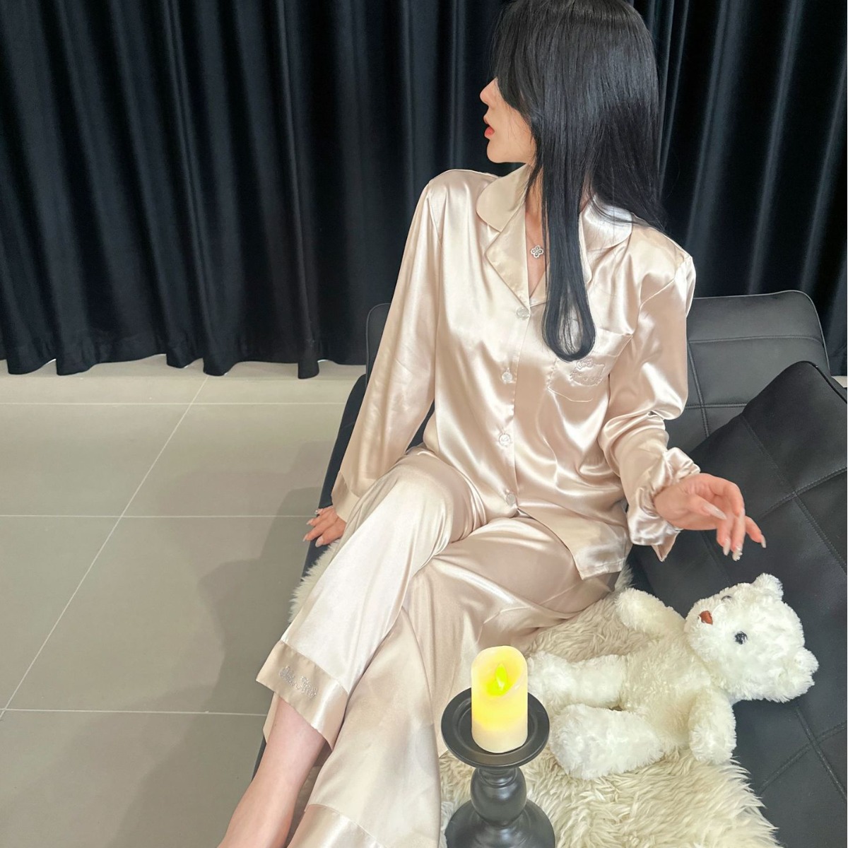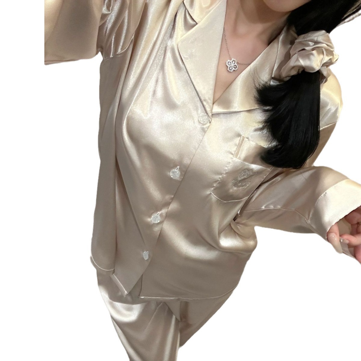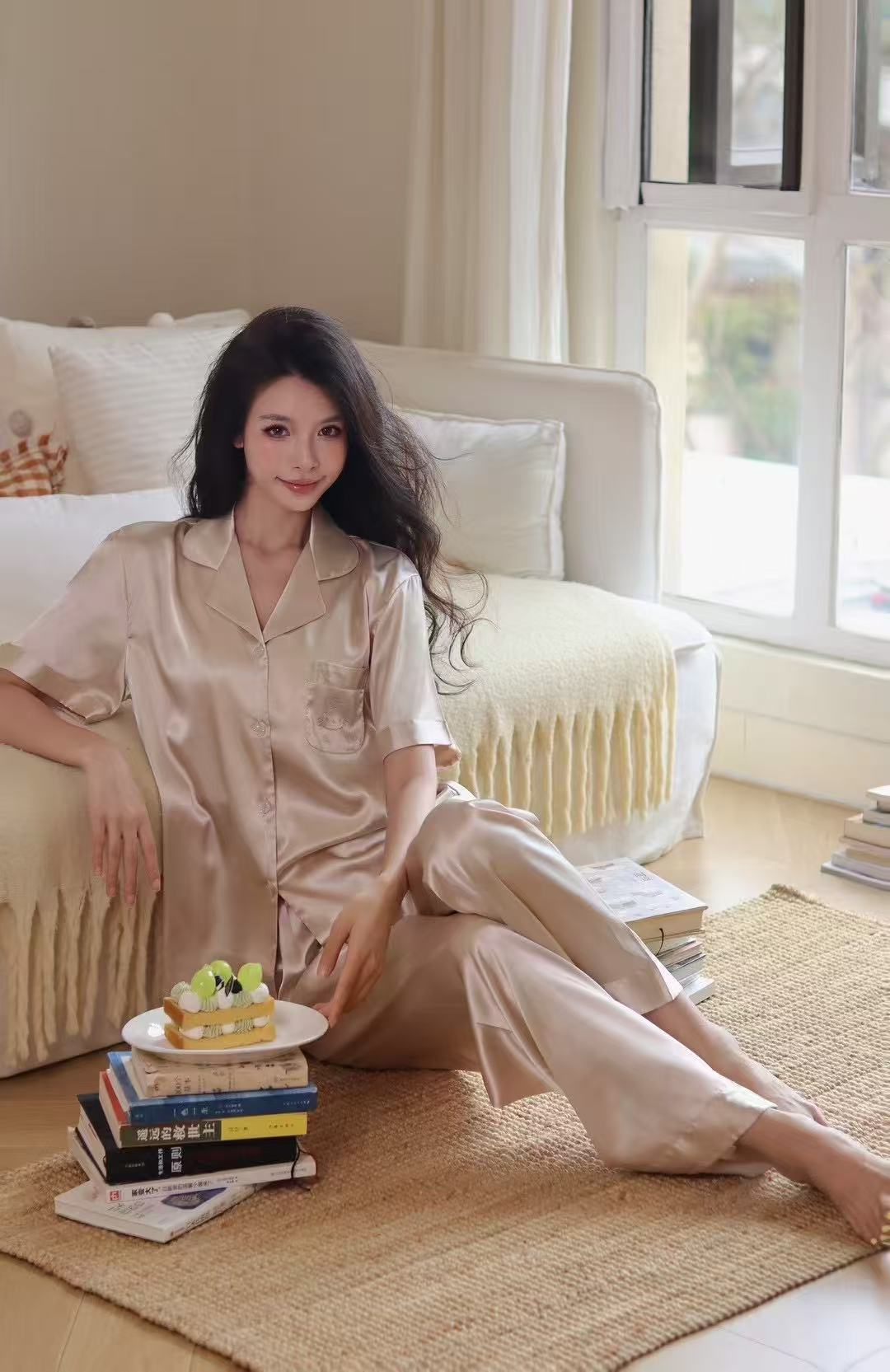 Главная страница > YASE【Gilded】Женский летний комплект для дома из высококачественного ледяного шелка с принтом кошки и стразами во французском стиле