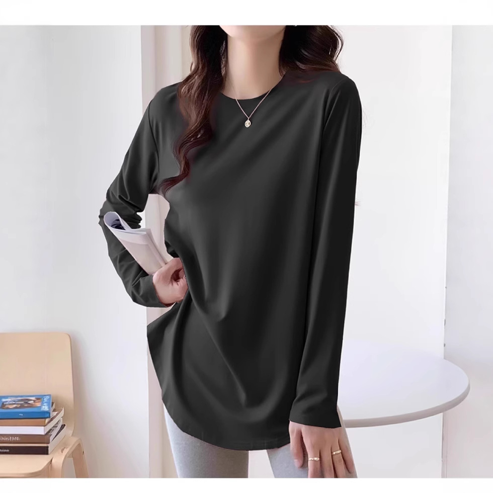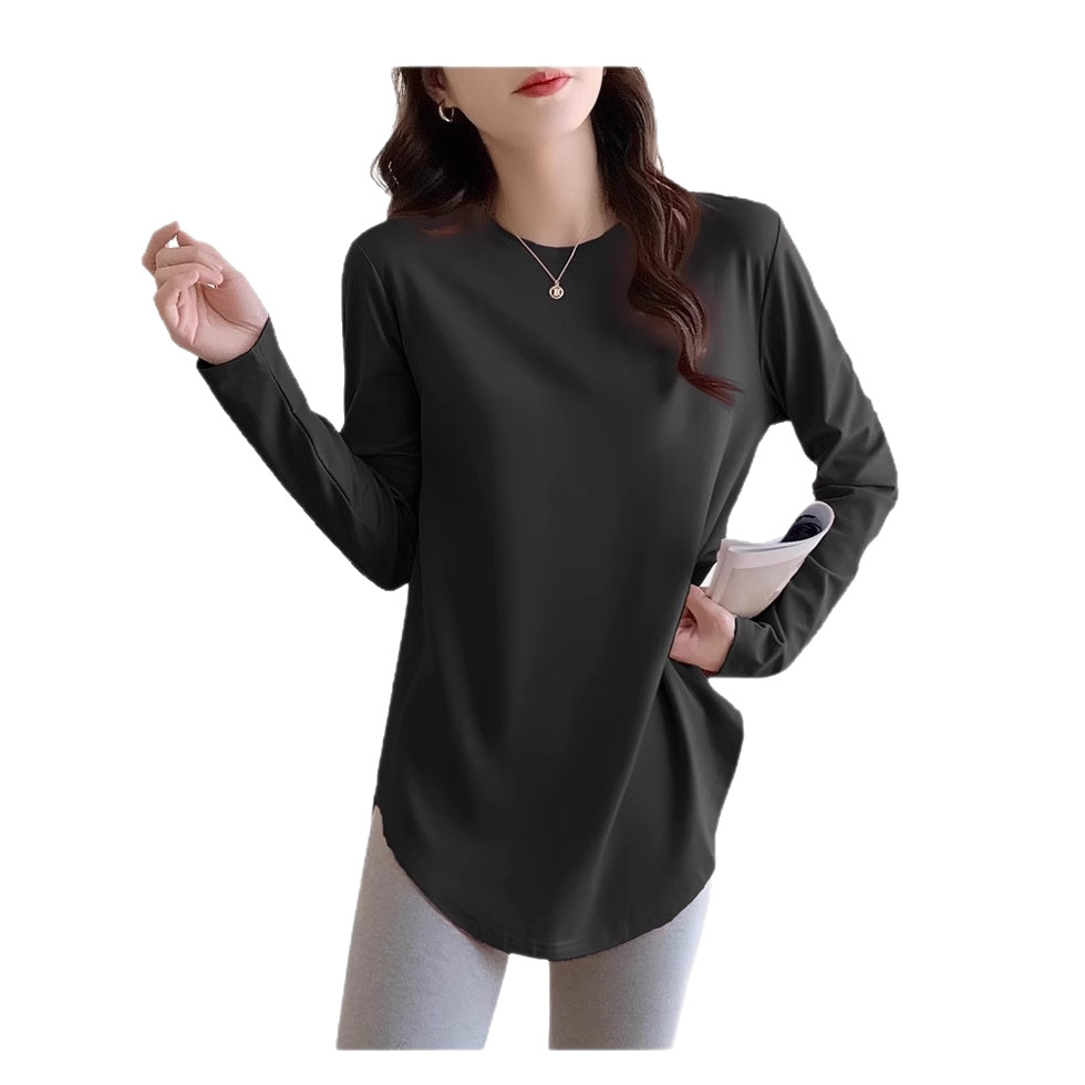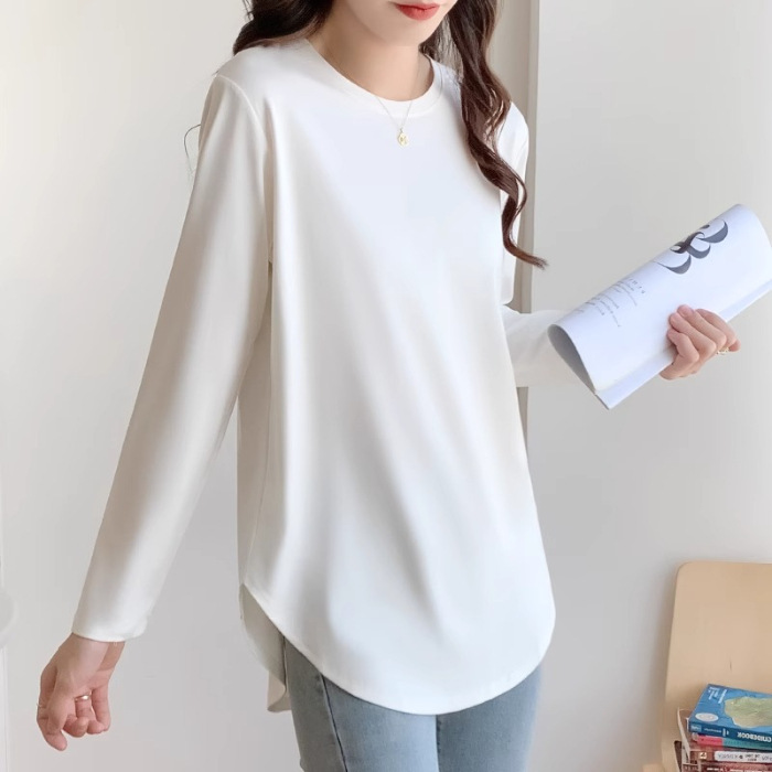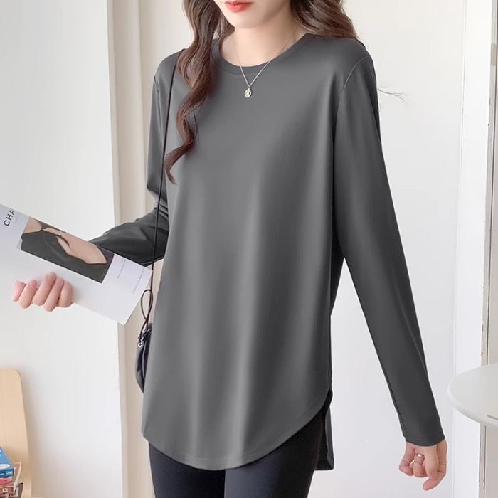 Главная страница > Однотонная женская футболка средней длины с длинными рукавами, уменьшающая возраст, весной и осенью, с закругленным краем, свободный топ большого размера и нижняя рубашка