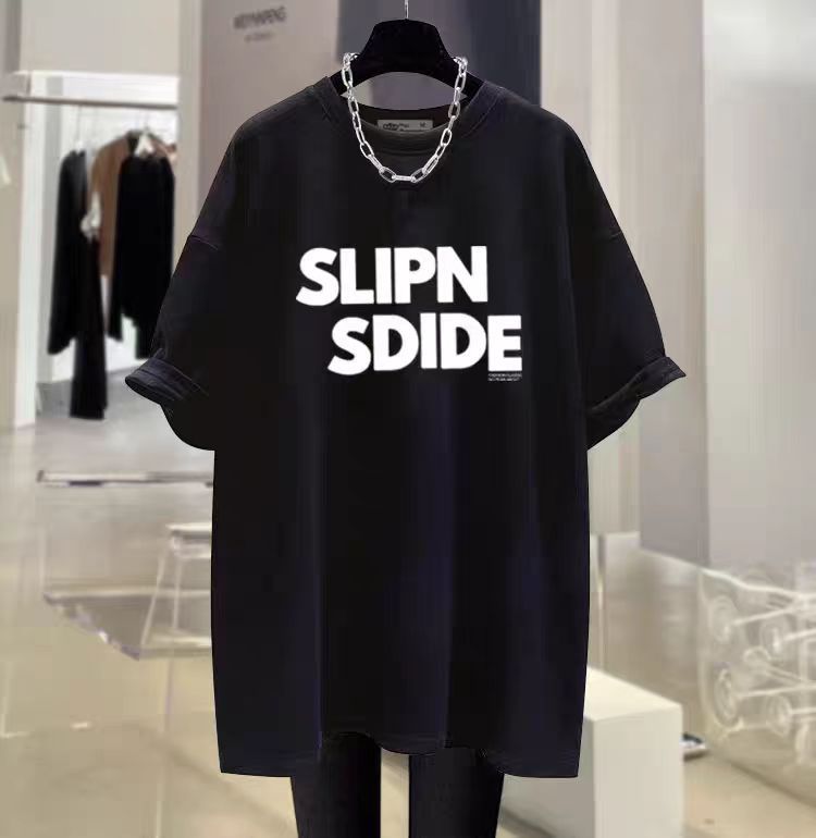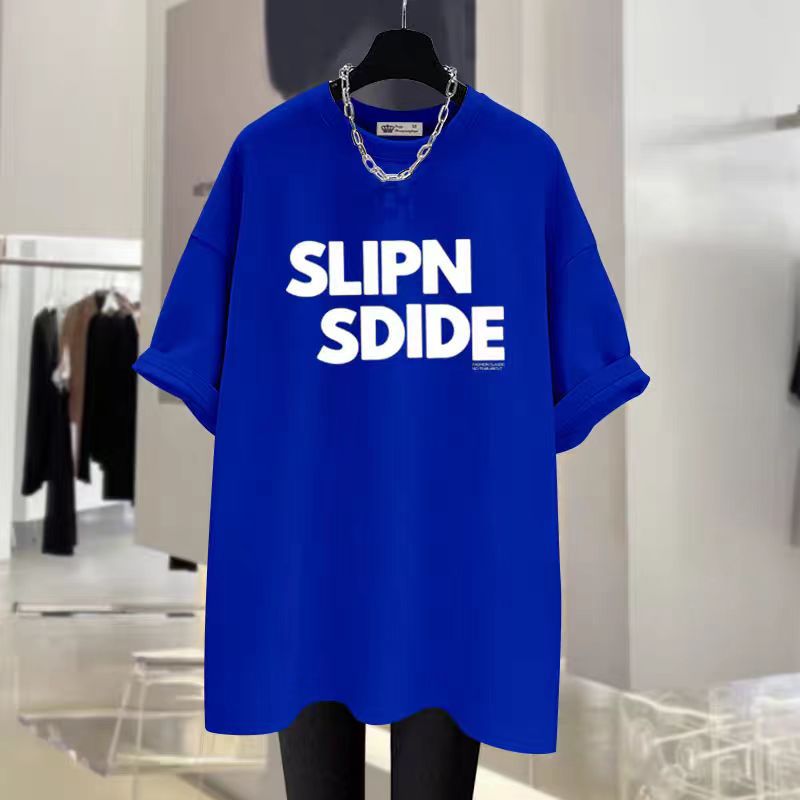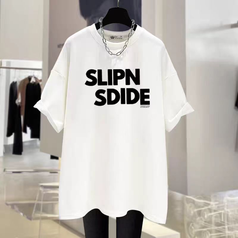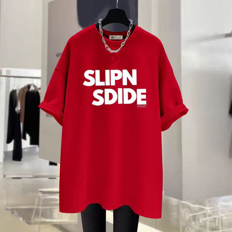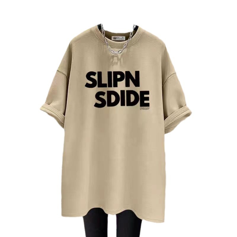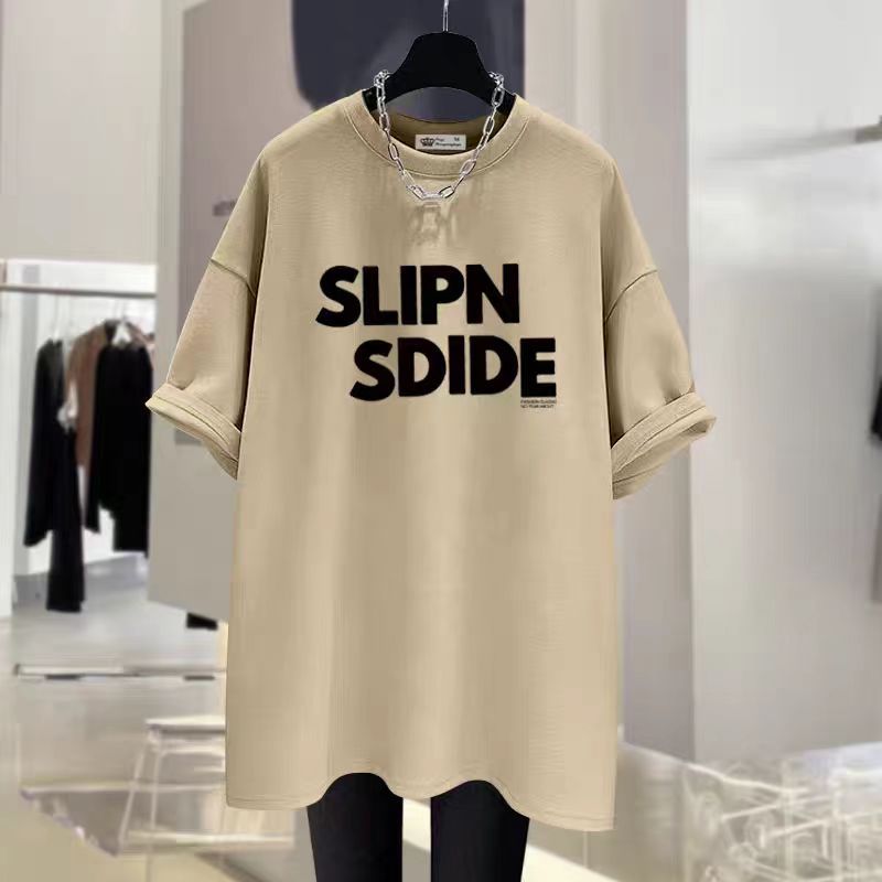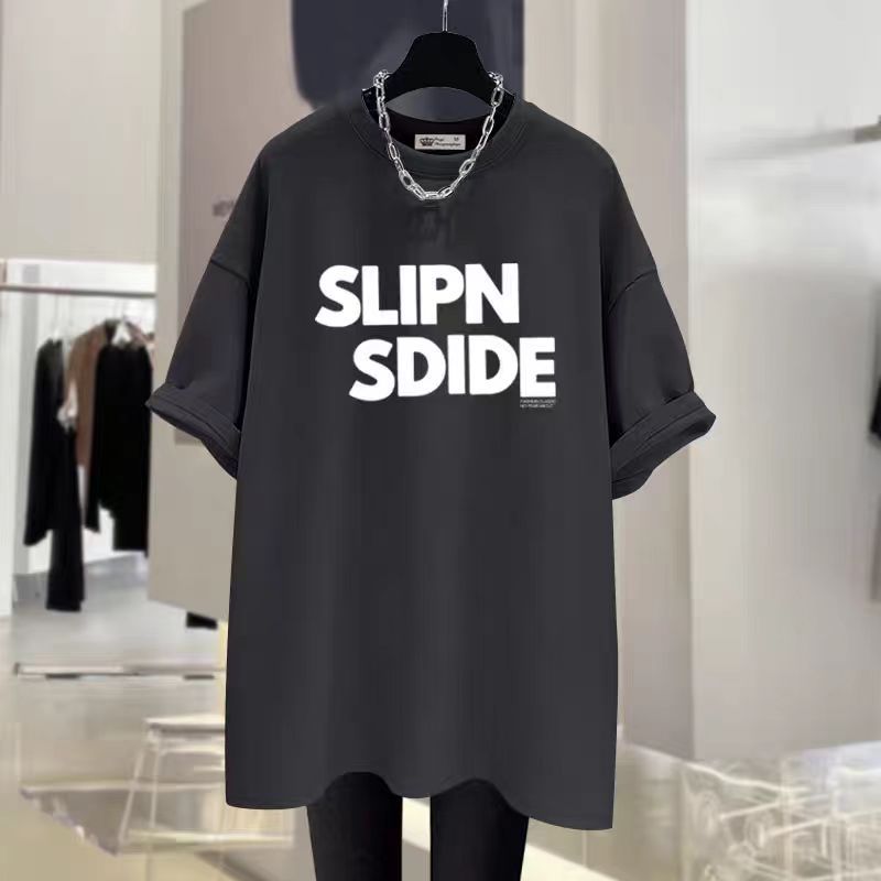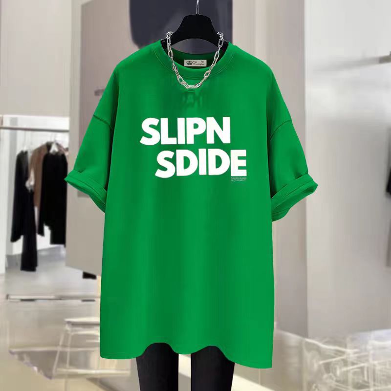 Главная страница > Зеленая футболка с круглым вырезом Женская короткая рукава хлопок 2024 Летняя новая буква иностранная повседневная свободная средняя длинная топ