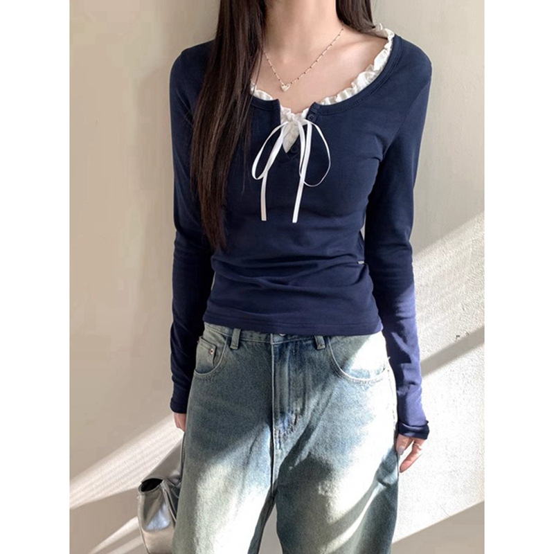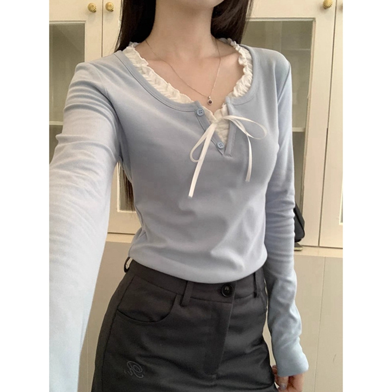Трансграничные кружевные сшитые ребра футболки с длинными рукавами женские осенние и зимние новые тонкие нижние рубашки шикарные короткие топы женские