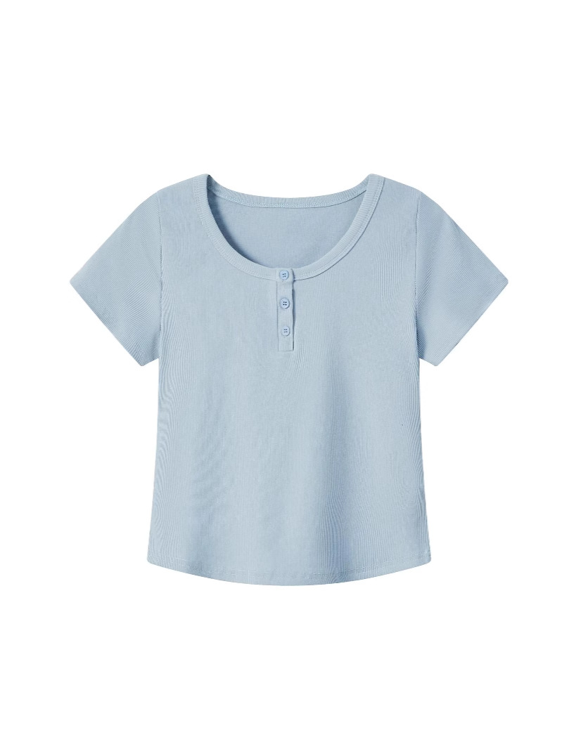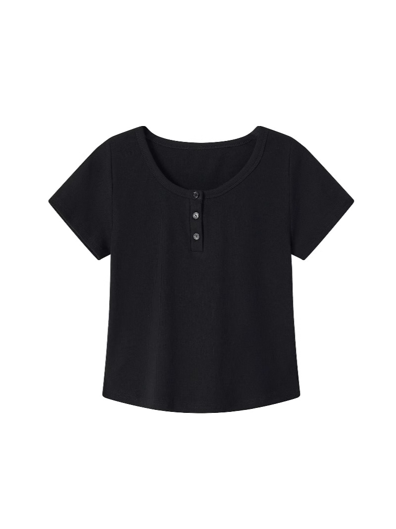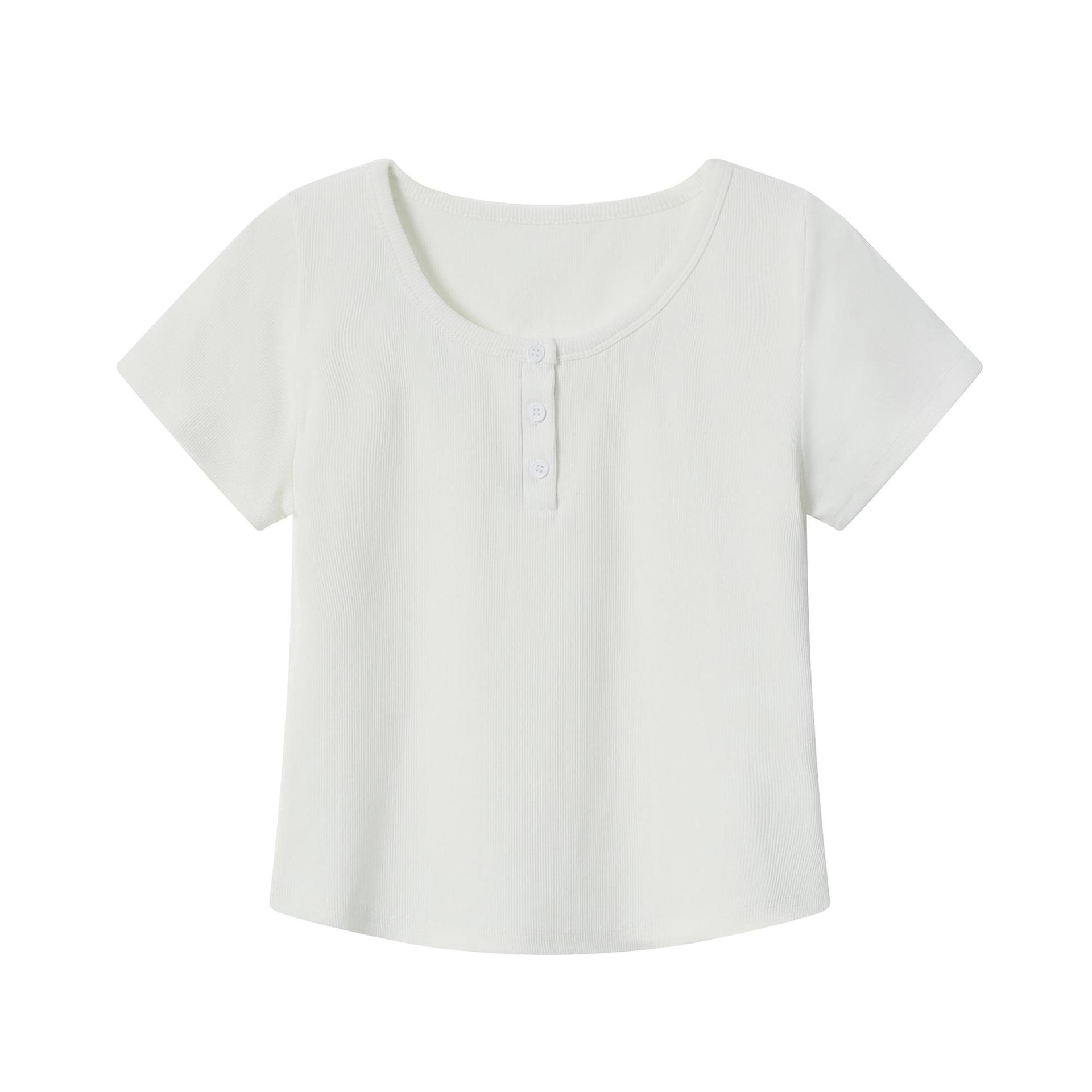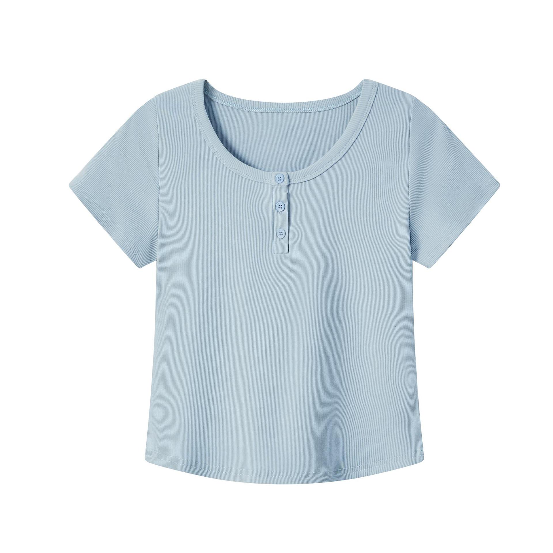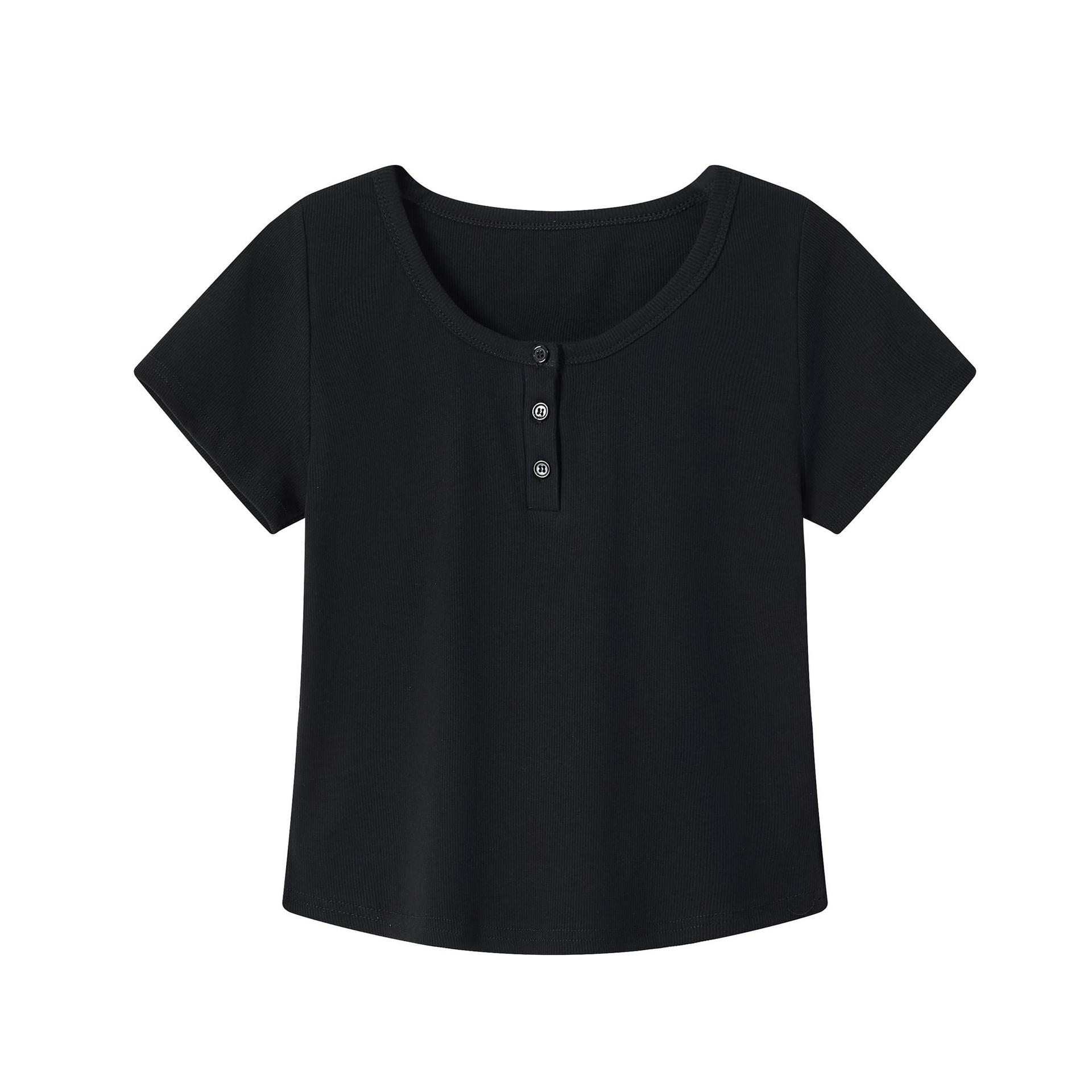 Главная страница > 2025 новая летняя футболка женская с коротким рукавом модная универсальная облегающая однотонная футболка с пуговицами