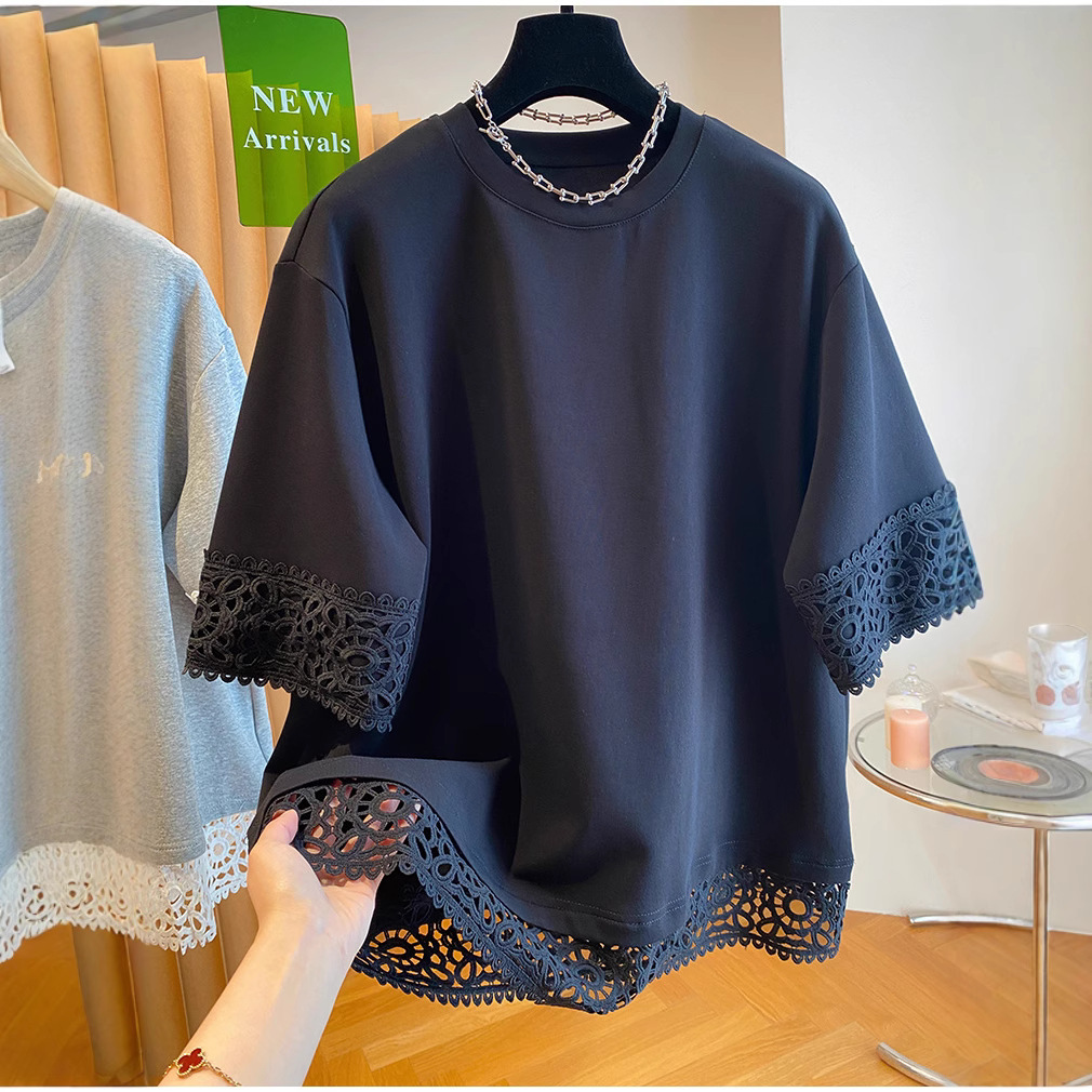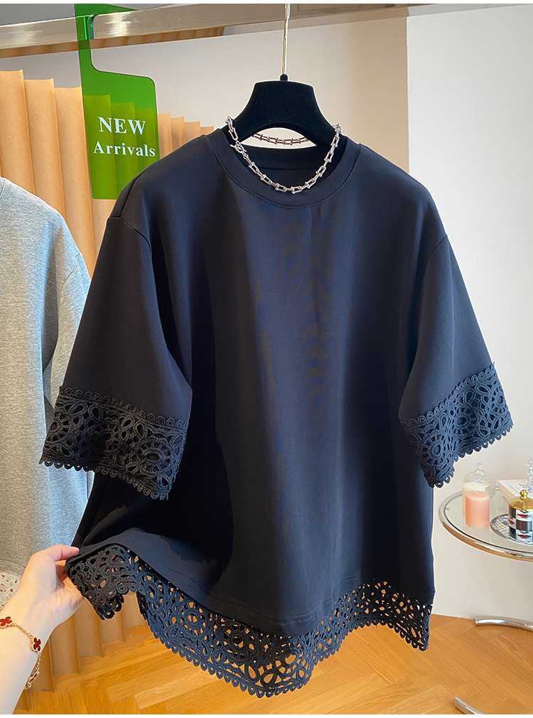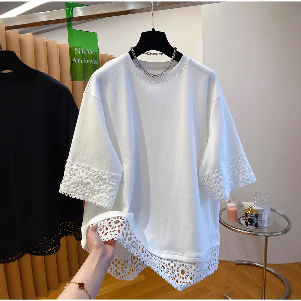 25 College Commuter Style 150kg Европейская кружевная лоскутная женская свободная повседневная футболка с короткими рукавами и круглым вырезом на весну.