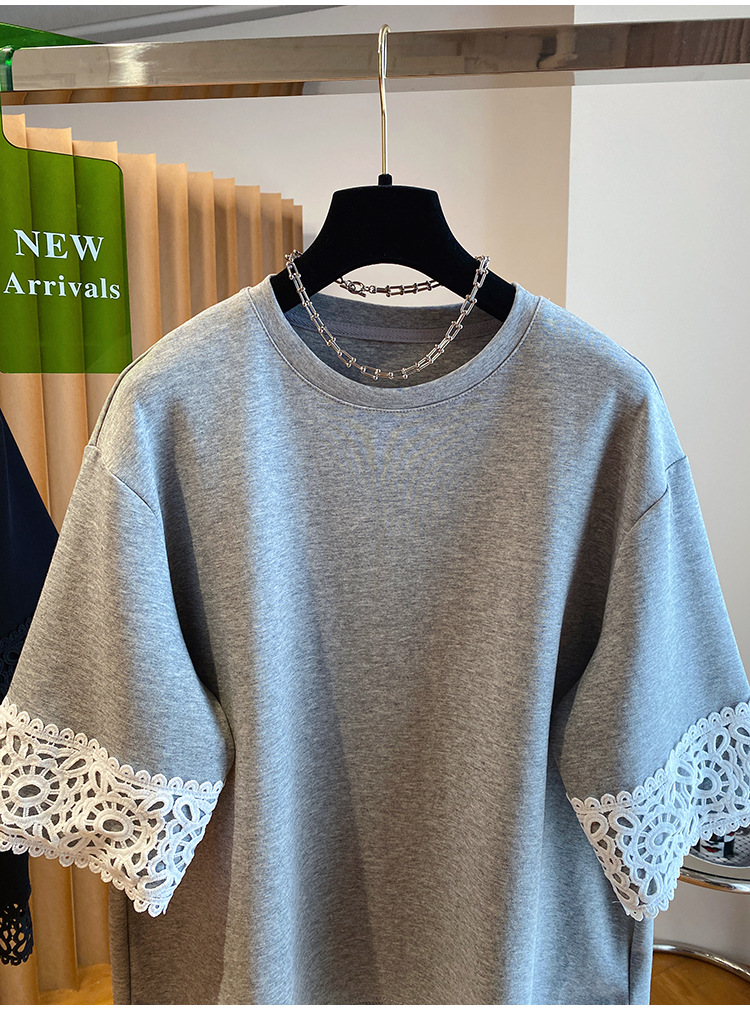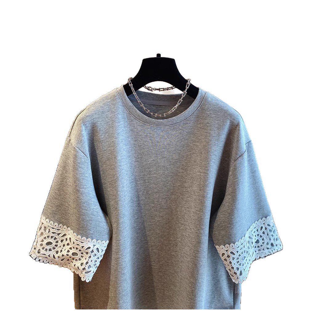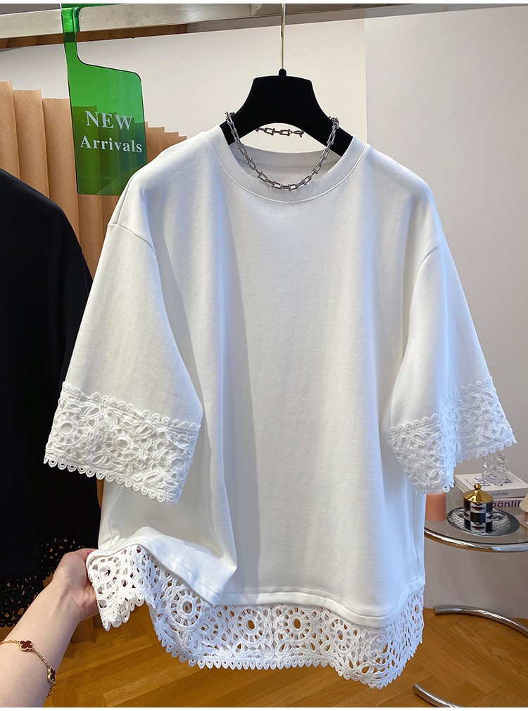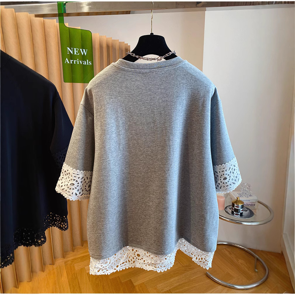 25 College Commuter Style 150kg Европейская кружевная лоскутная женская свободная повседневная футболка с короткими рукавами и круглым вырезом на весну.