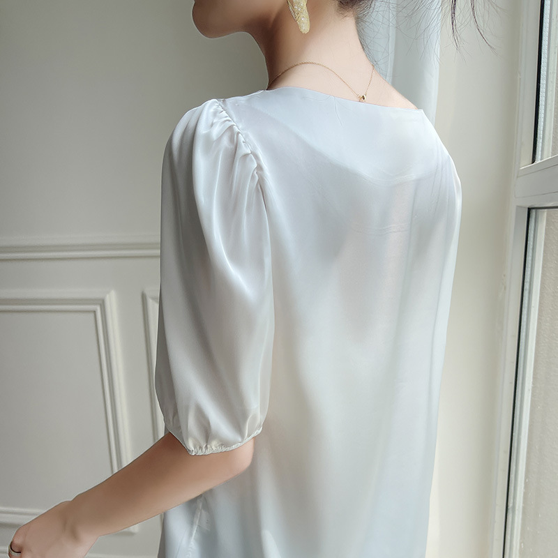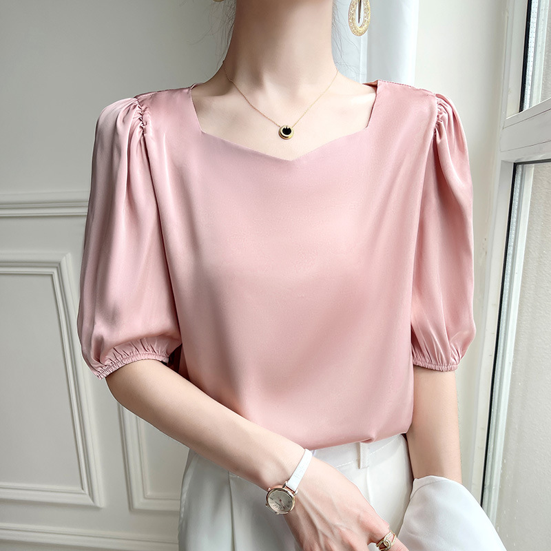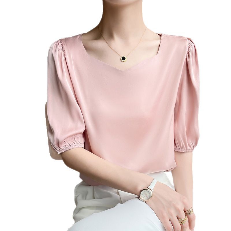 Главная страница > Женская футболка из искусственного шелка с короткими рукавами, атласная, новый стиль, элегантная дизайнерская блузка со средним рукавом, летний топ из шелкового шелка шелковицы
