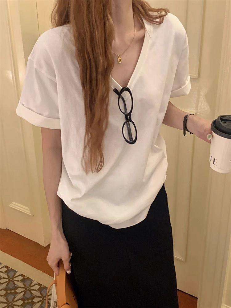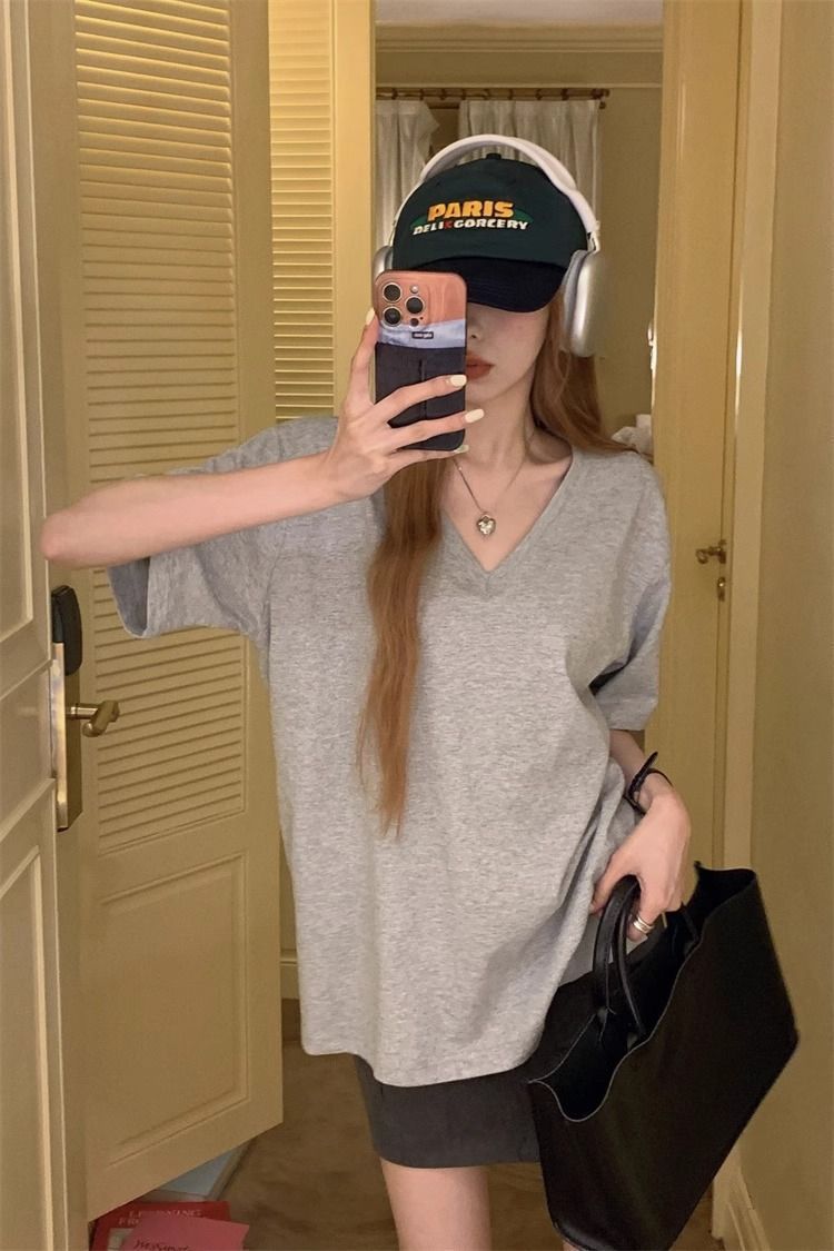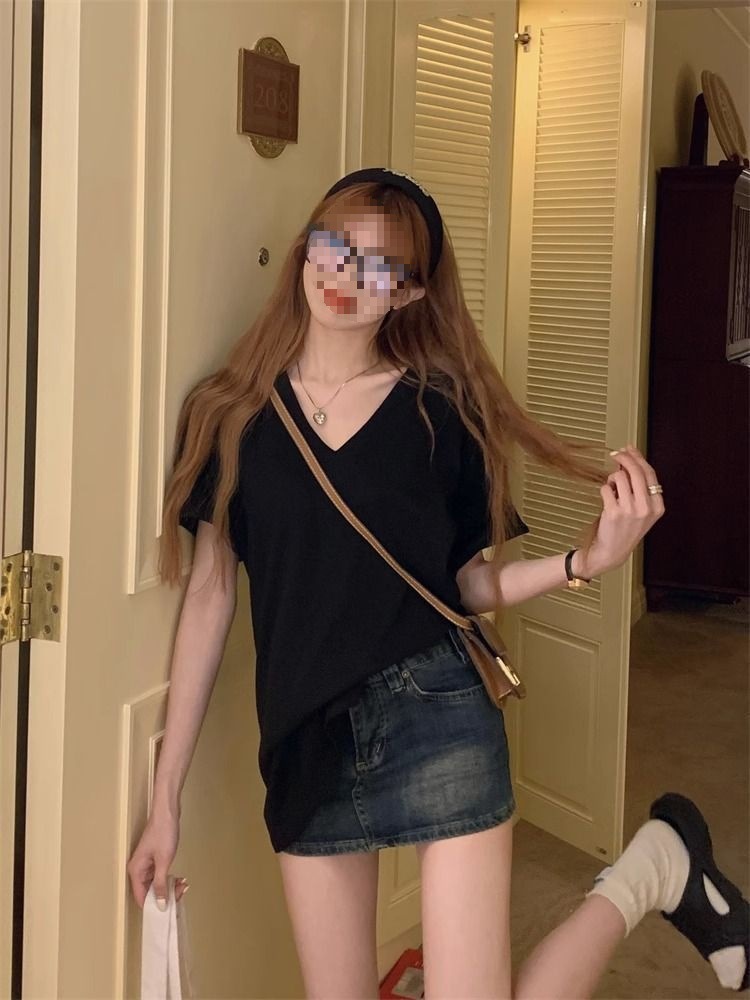 Главная страница > Женская футболка с V-образным вырезом, однотонная, с коротким рукавом, летняя новинка 2025 года, базовая, повседневная, в корейском стиле, утягивающая, свободная, для студентов.
