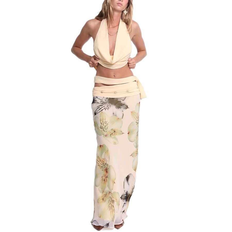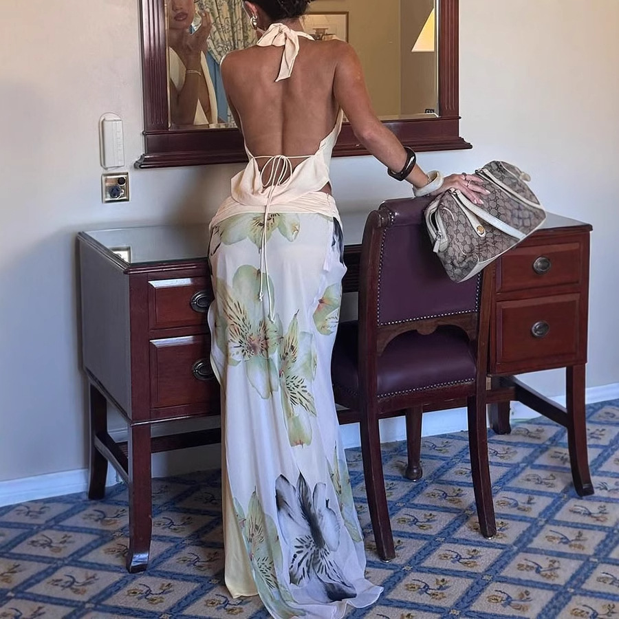 Главная страница > Европейский и американский стиль, кросс-бордер 2025, новый женский сексуальный топ-халтер с открытой спиной, облегающая длинная юбка с принтом, комплект из двух предметов