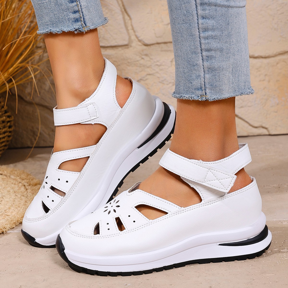Главная страница > Женские летние сандалии больших размеров 2025 года, европейско-американский стиль, круглый носок, на толстой подошве, с перфорацией и липучкой, однотонные.