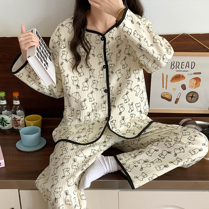 Главная страница > Воздушные хлопчатобумажные пижамы женские осенние и зимние длинные рукава сэндвич утолщение 2024 новая волновая точка ватный набор одежды для дома