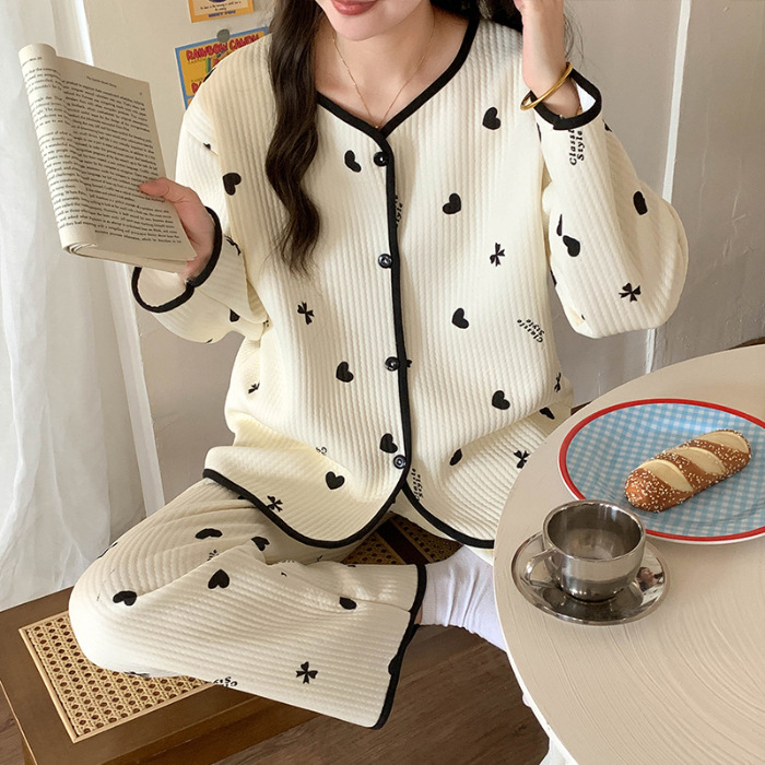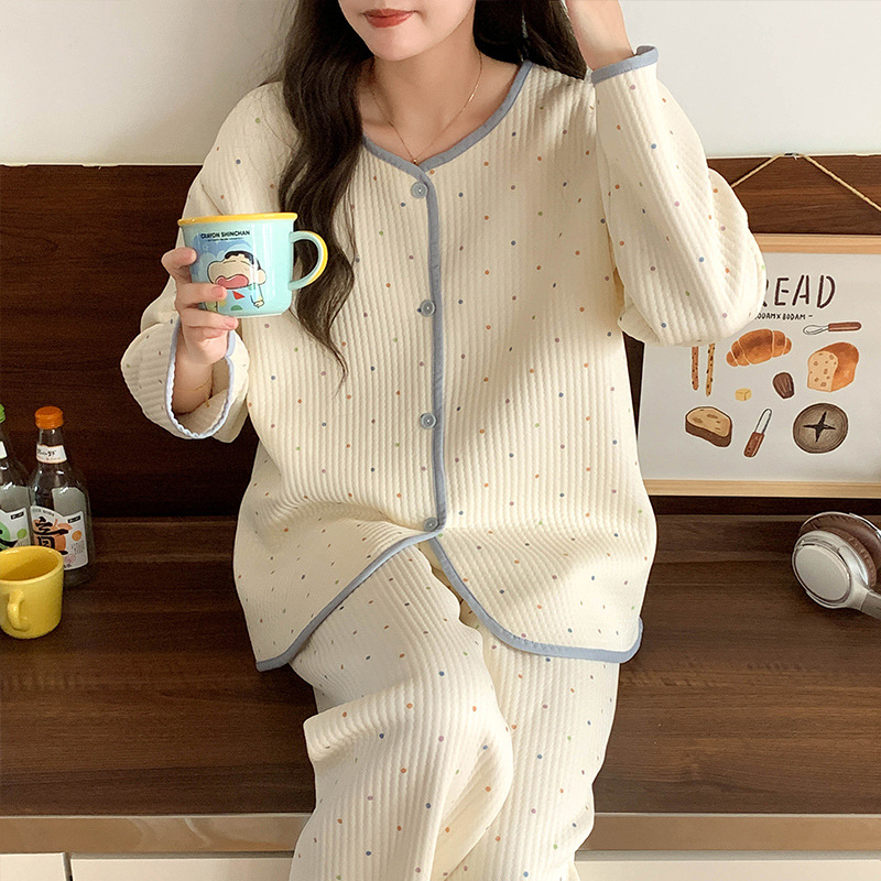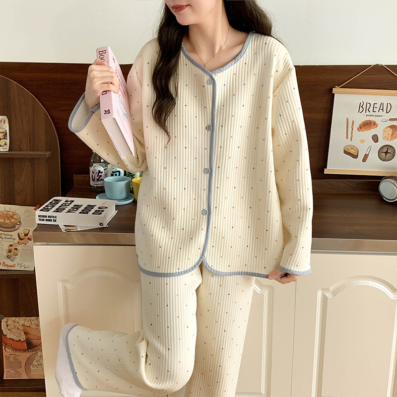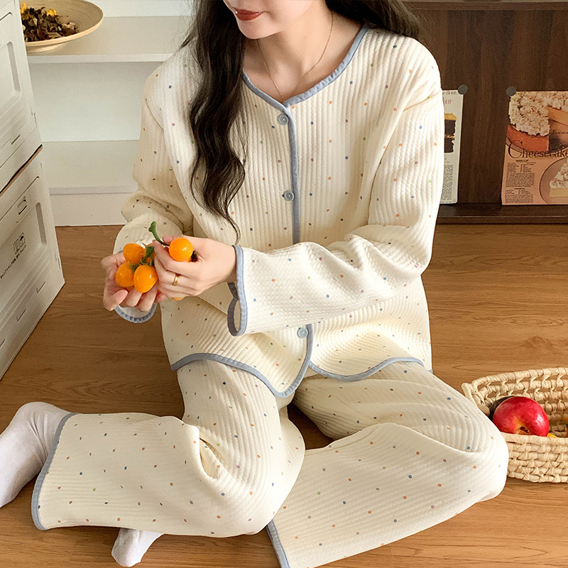Воздушные хлопчатобумажные пижамы женские осенние и зимние длинные рукава сэндвич утолщение 2024 новая волновая точка ватный набор одежды для дома