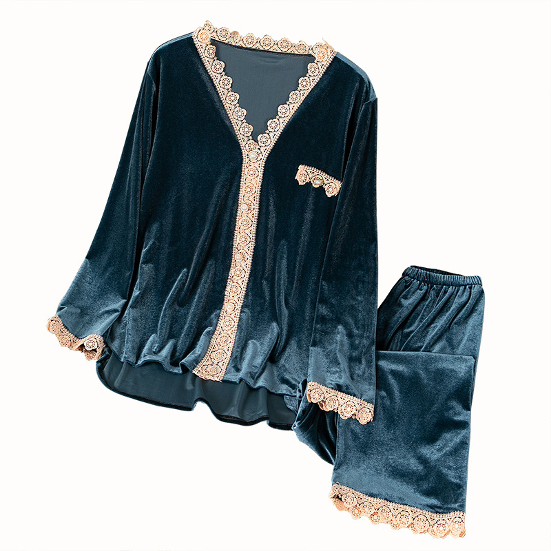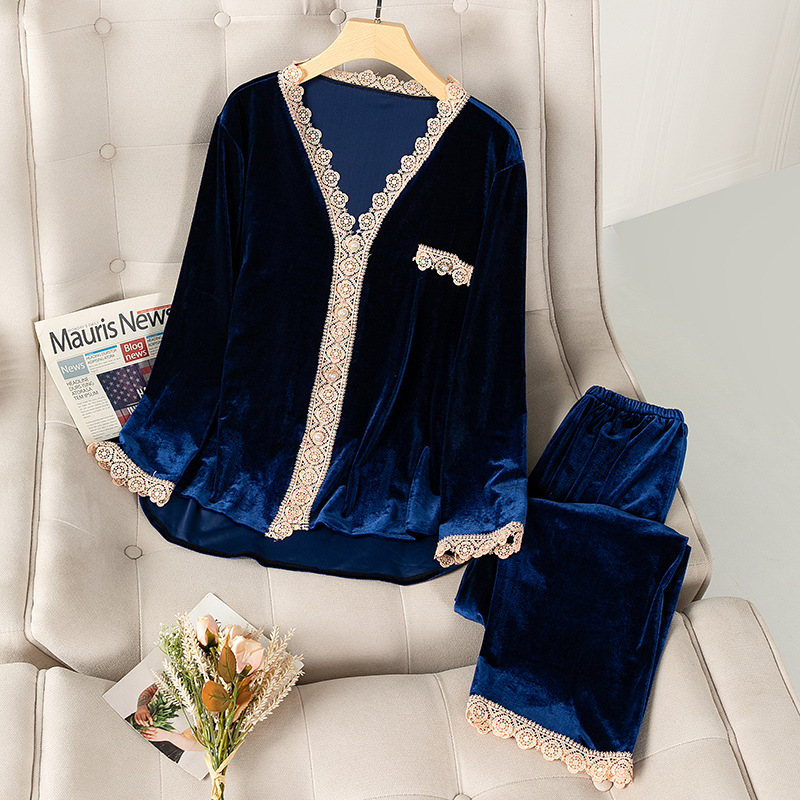 Главная страница > Золотая бархатная Пижама женская осень и зима 2023 новые брюки с длинным рукавом костюм кружевной кардиган наряд