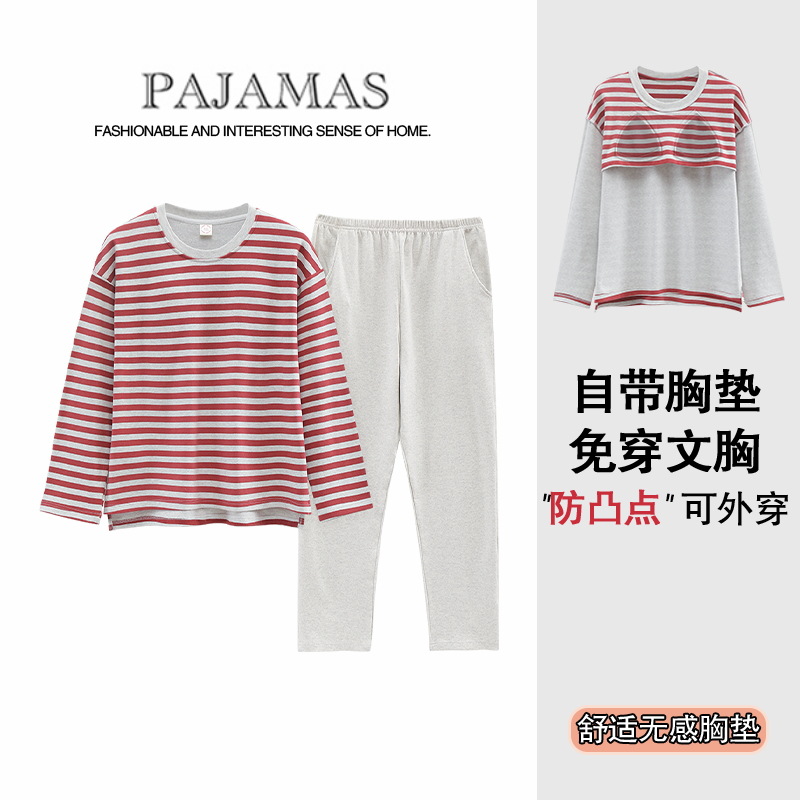 Пижама женская весна новый хлопок модный высокий цвет ленивый ветер длинные рукава брюки два с нагрудными подушками набор домашней одежды