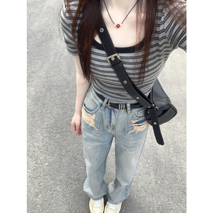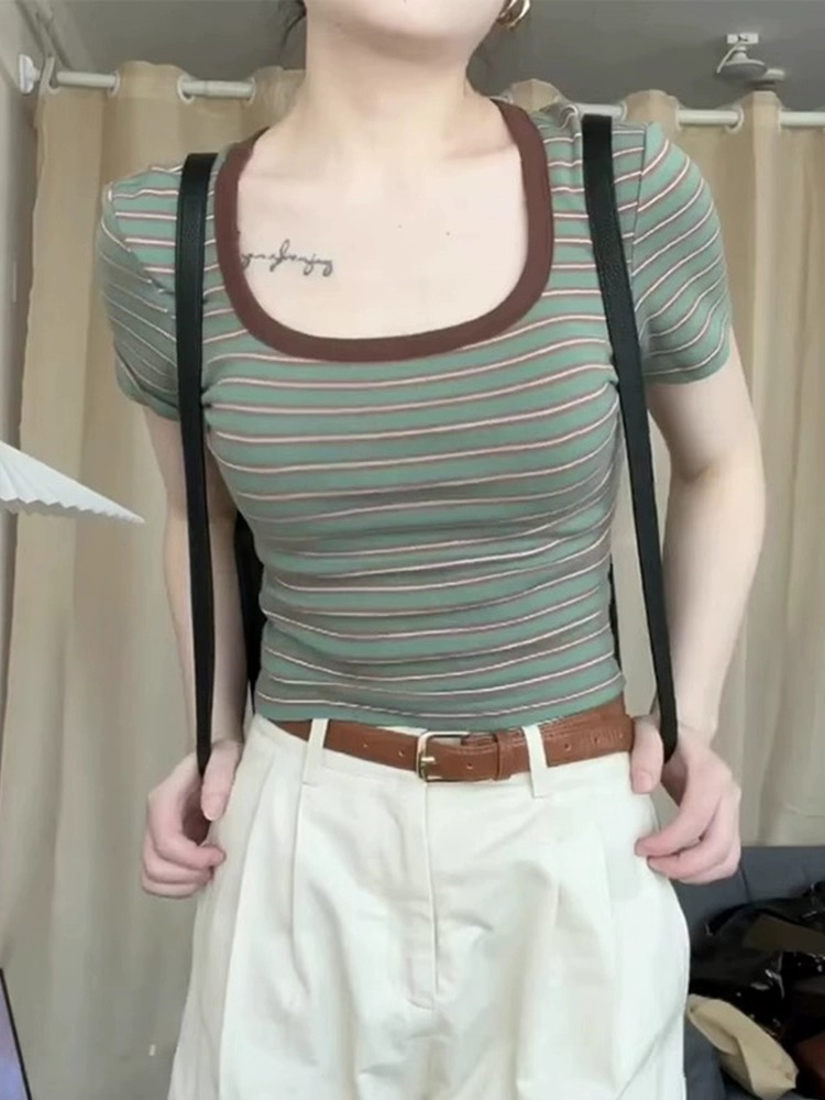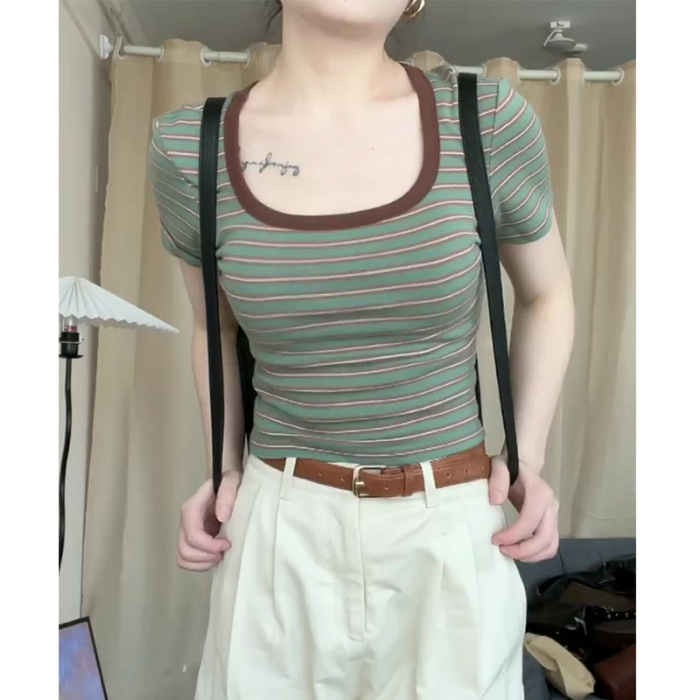 Американский ретро с воротником в плечо в полоску футболка женская короткая рукава Лето 2024 новый нишевой тонкий тонкий короткий топ