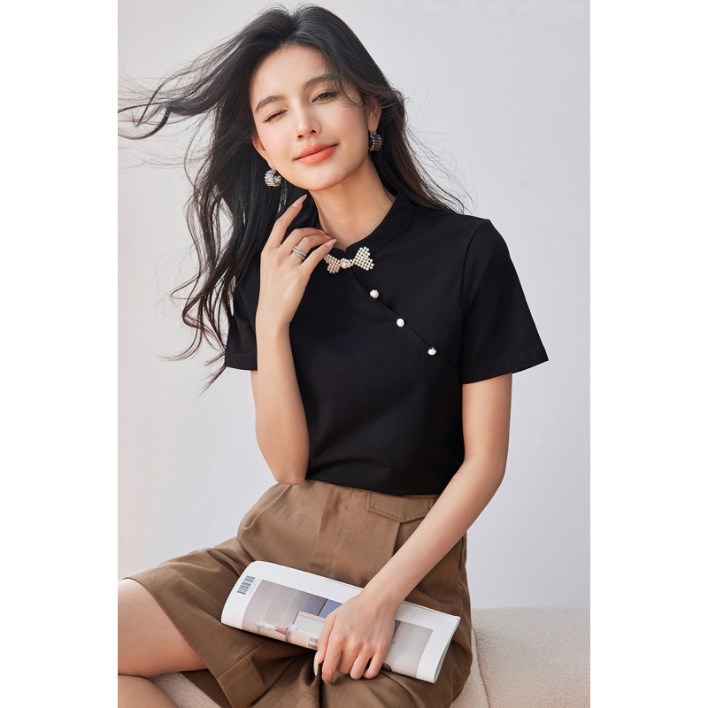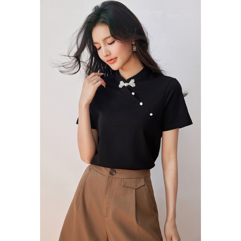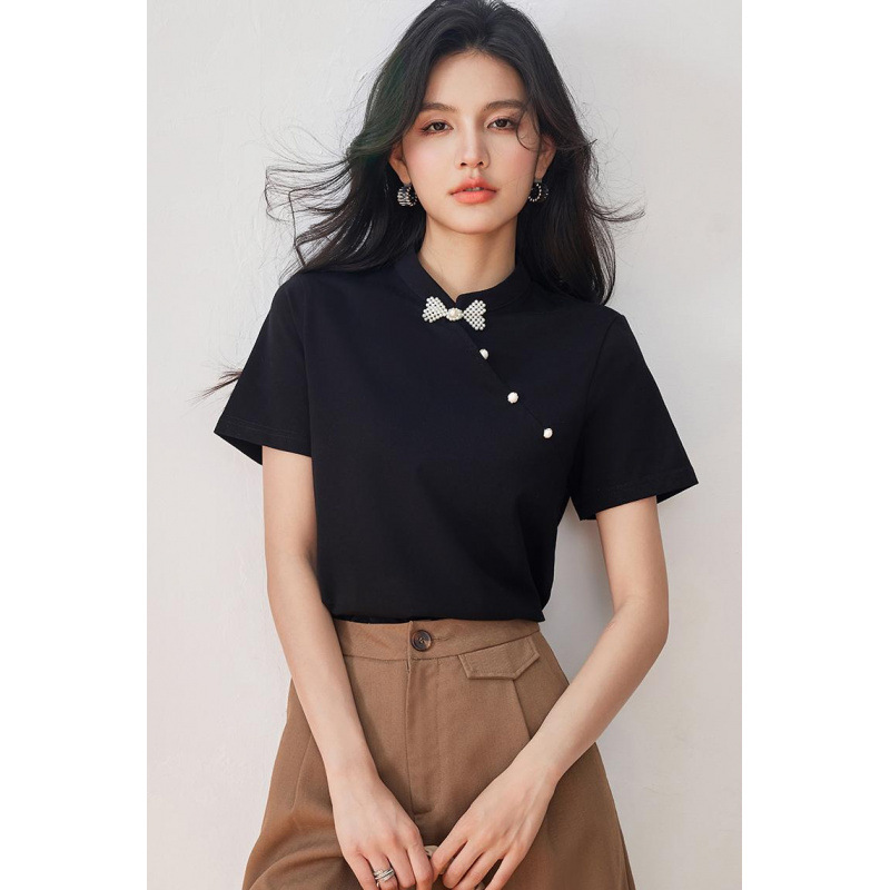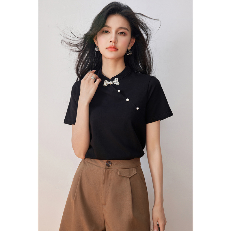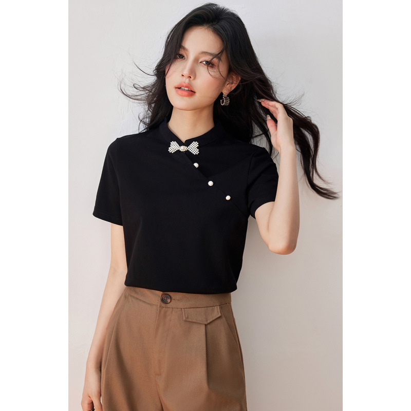 Главная страница > Новая китайская жемчужная футболка с пряжкой женская короткая рукава 2025 летний новый модный дизайн cheongsam с воротником