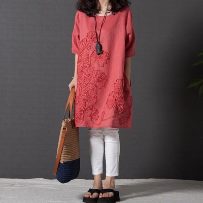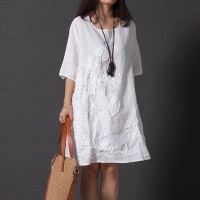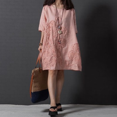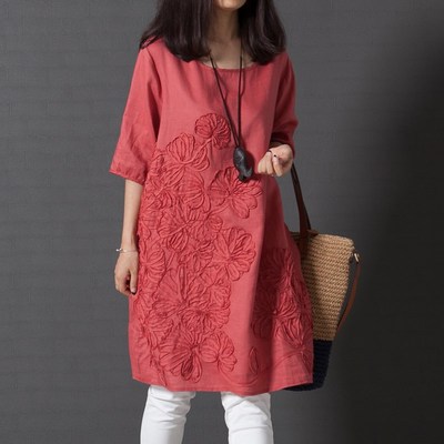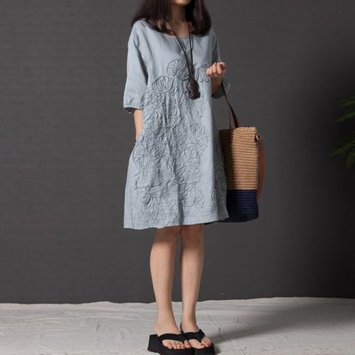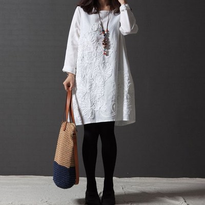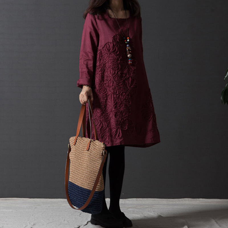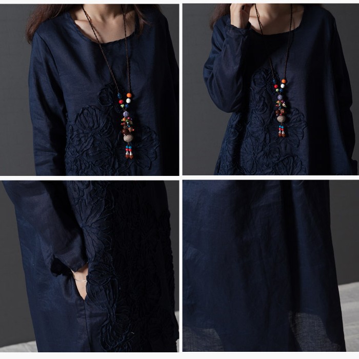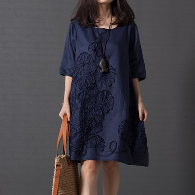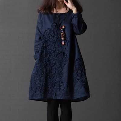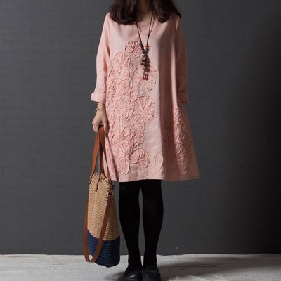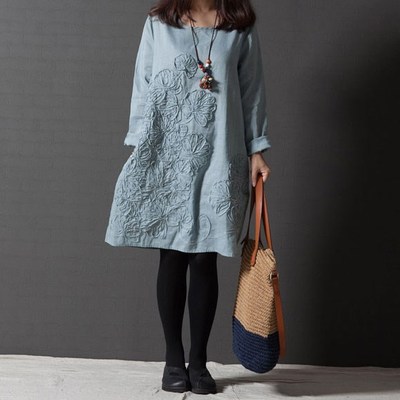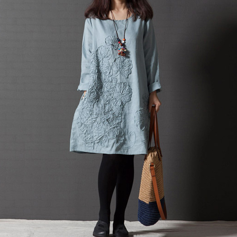Главная страница > Модное женское платье больших размеров 2025 года в художественном стиле, свежее, свободное, с вышивкой, с длинными рукавами, из хлопка и льна