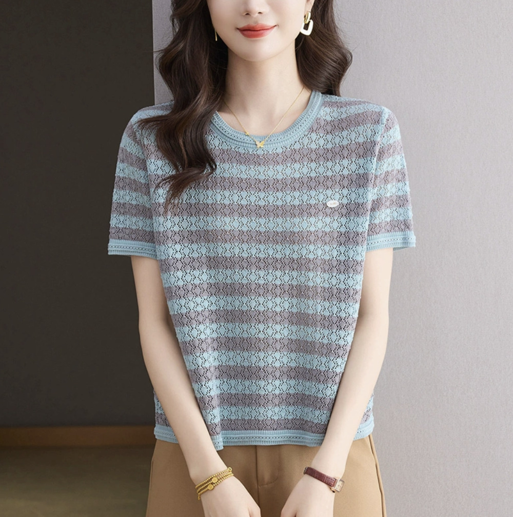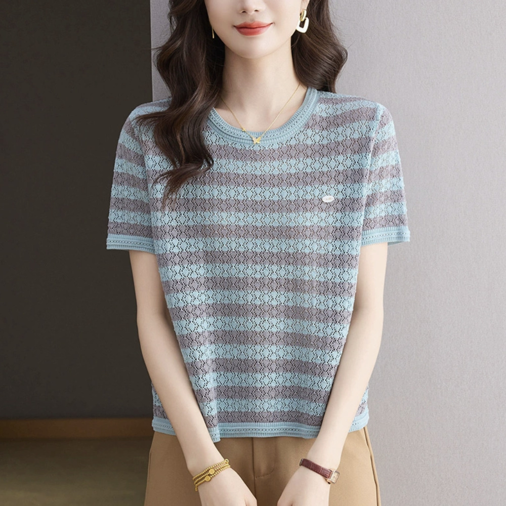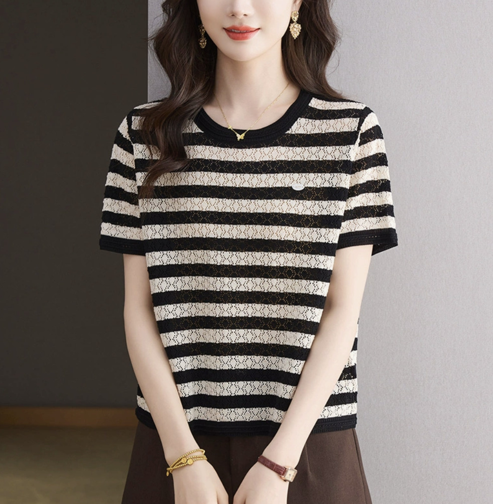 Главная страница > Женская летняя футболка из тонкой трикотажной ткани «ледяной шелк» в полоску, короткий рукав, новинка 2025 года, для женщин среднего возраста, с вырезом, тонкая подкладка