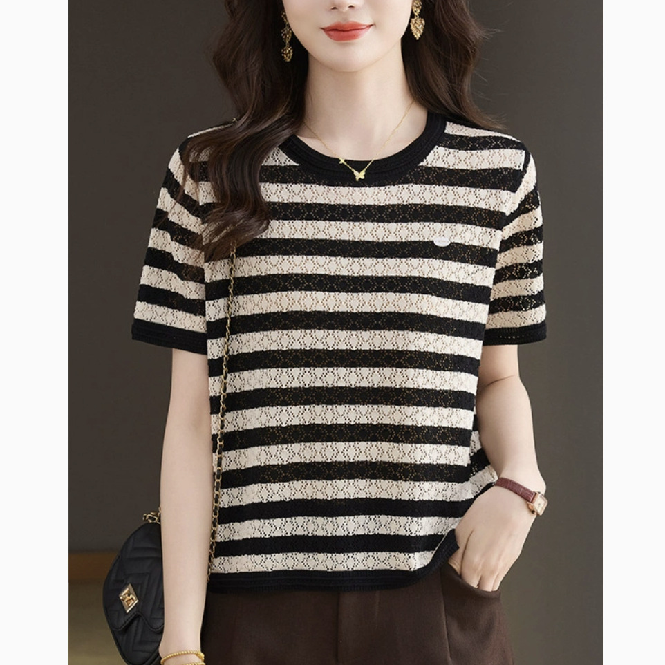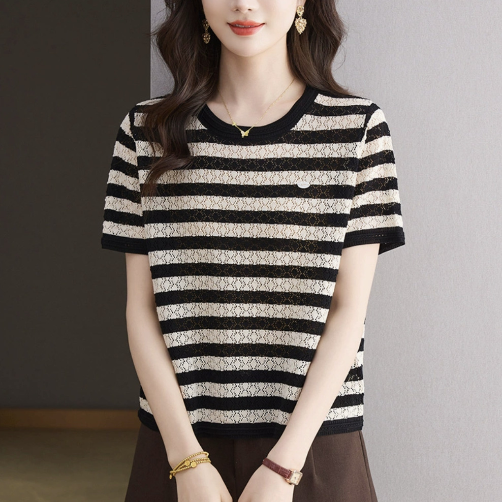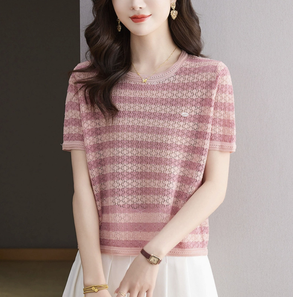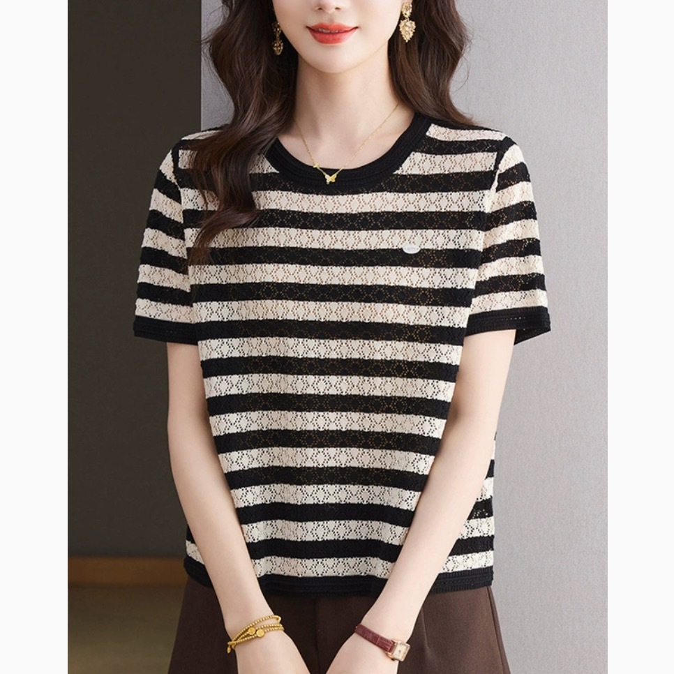 Главная страница > Женская летняя футболка из тонкой трикотажной ткани «ледяной шелк» в полоску, короткий рукав, новинка 2025 года, для женщин среднего возраста, с вырезом, тонкая подкладка