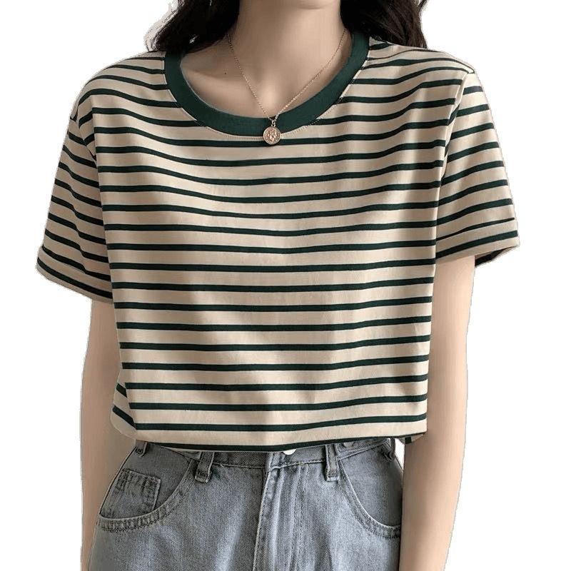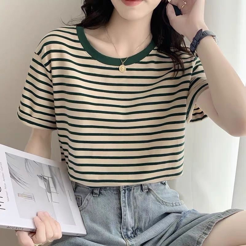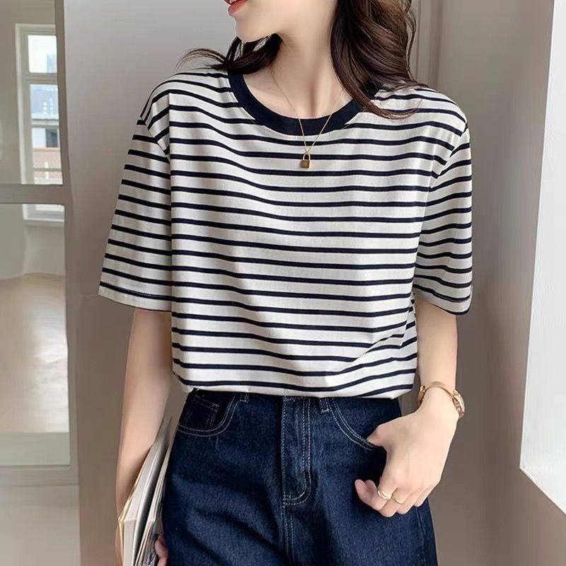 Главная страница > Белая полосатая рубашка женская с коротким рукавом, лето 2025, новинка весны и осени, утягивающий топ, свободная футболка с круглым вырезом