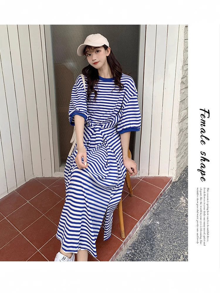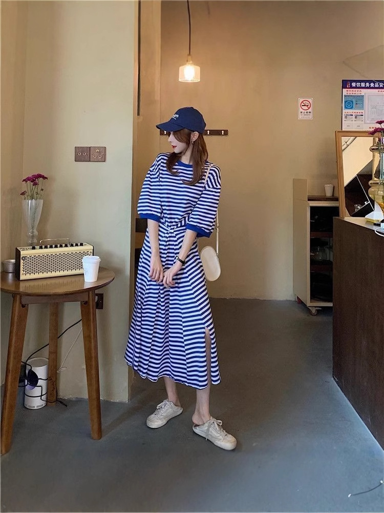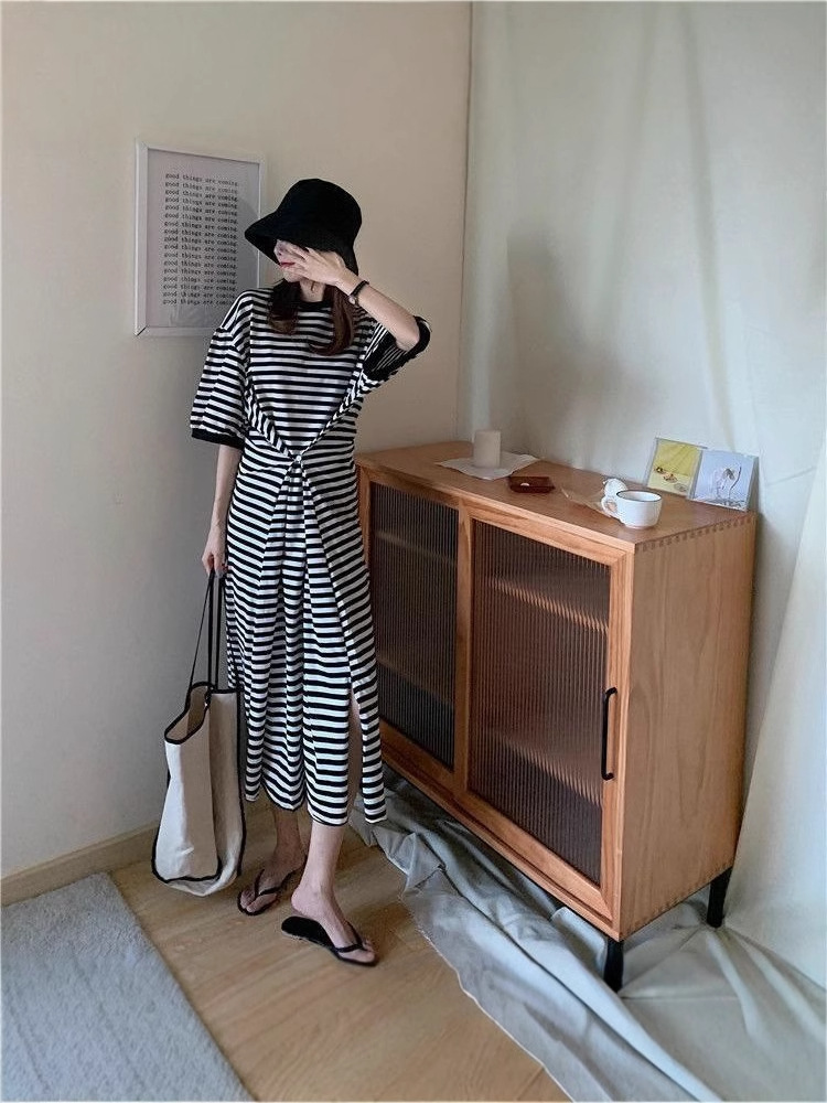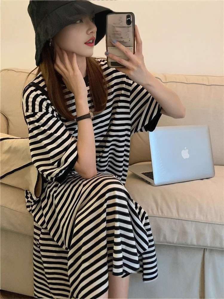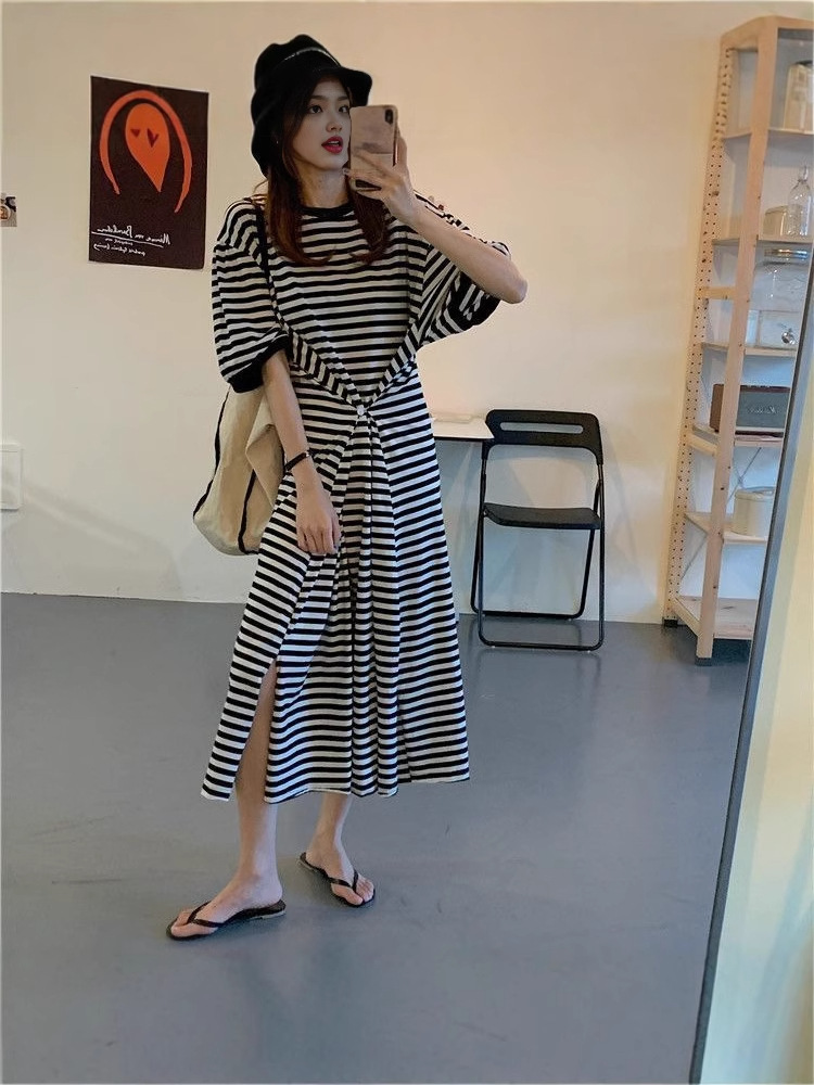 Главная страница > Ленивый ветер свободен до колен с развилкой в полоску футболка юбка весной