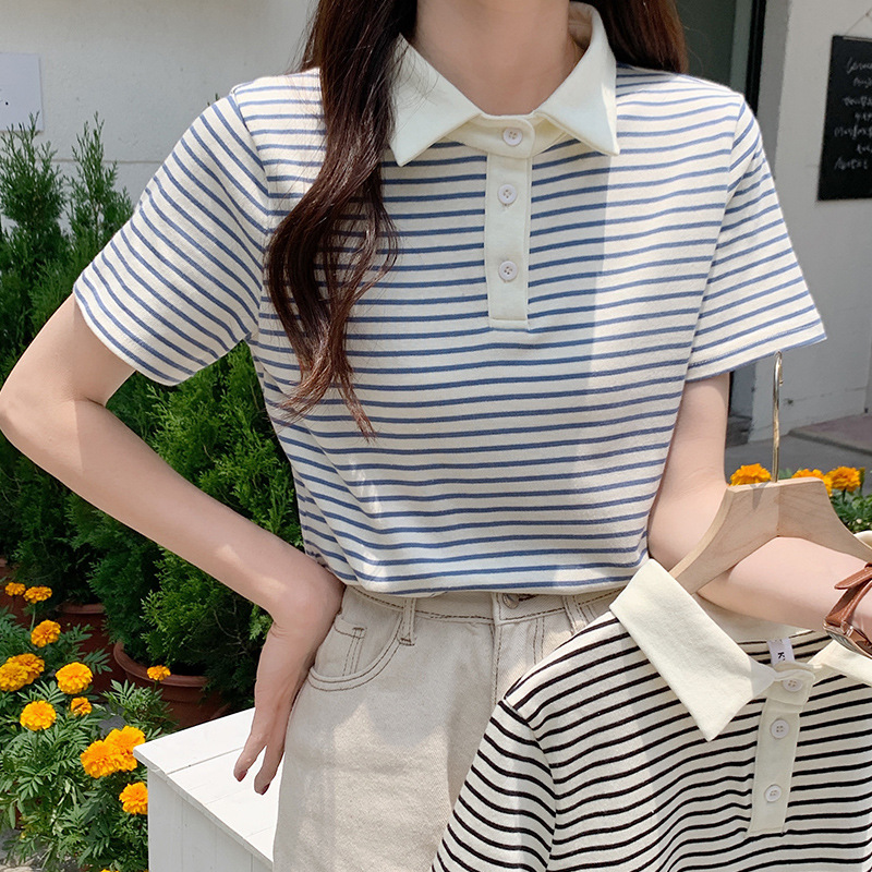 Главная страница > Лето 2025, новая повседневная футболка из чистого хлопка на правое плечо, женская универсальная свободная футболка с короткими рукавами и воротником-поло в полоску, топ