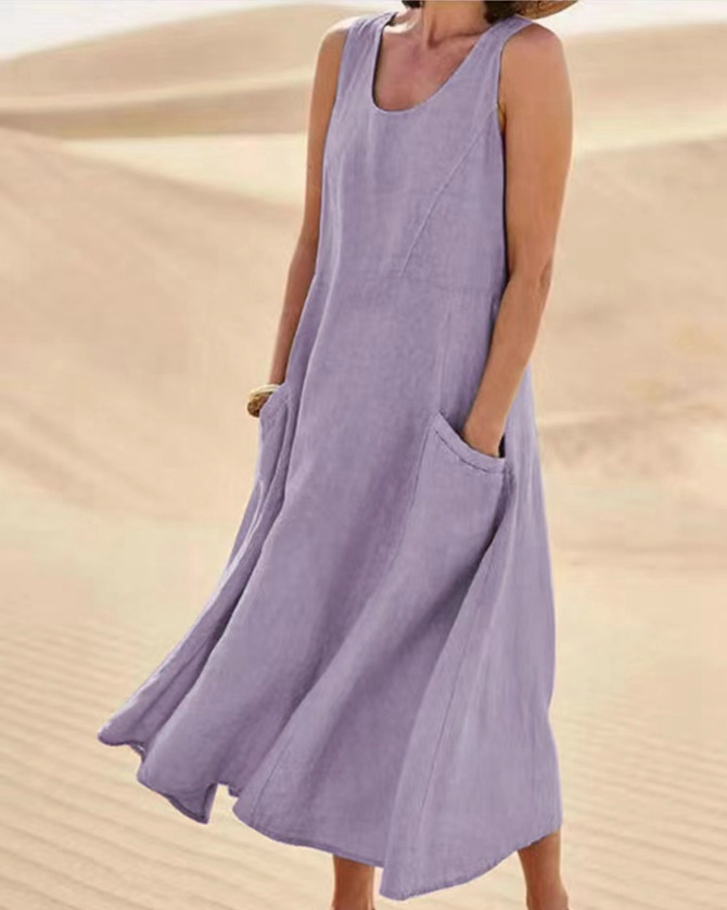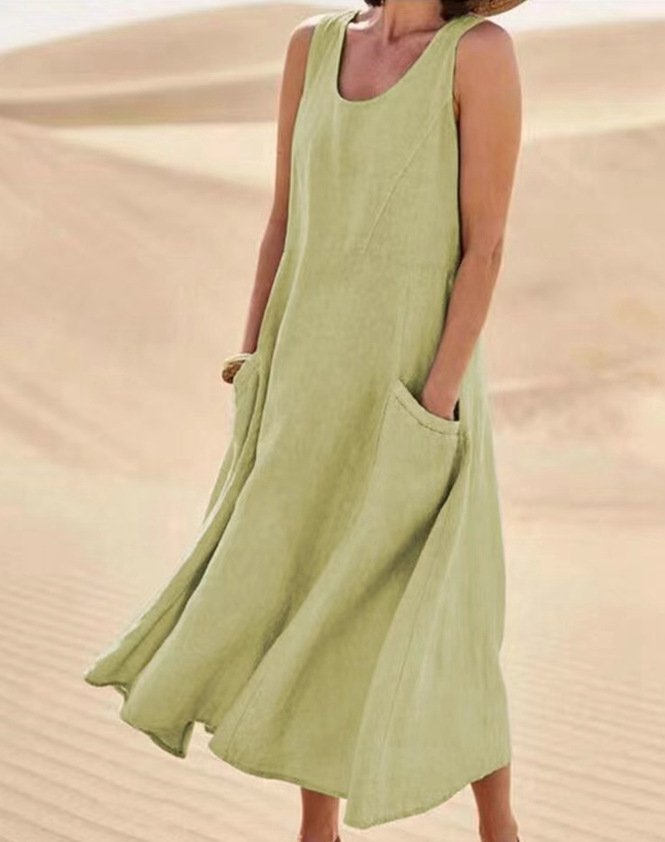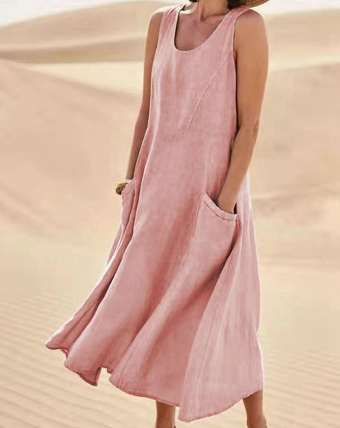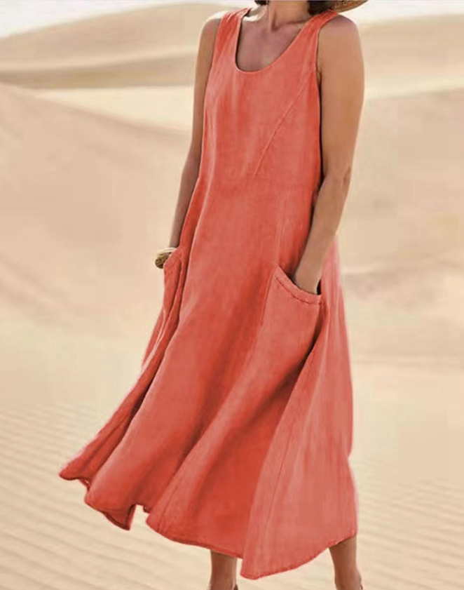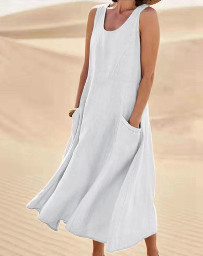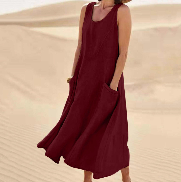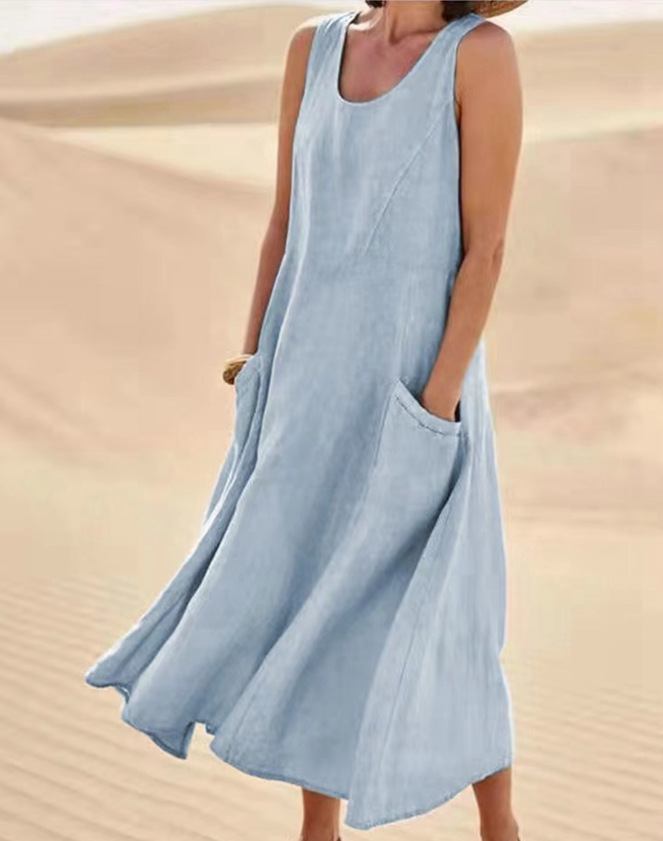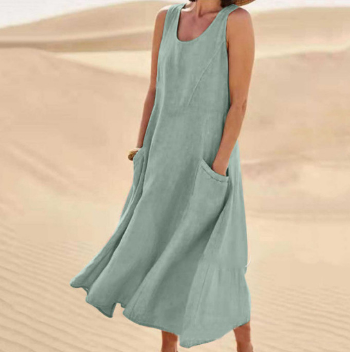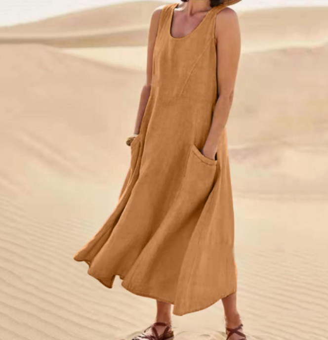 2025 Amazon Independent Station Лето Европа и США Внешняя торговля карманы без рукавов с круглым вырезом женские хлопковые и льняные платья